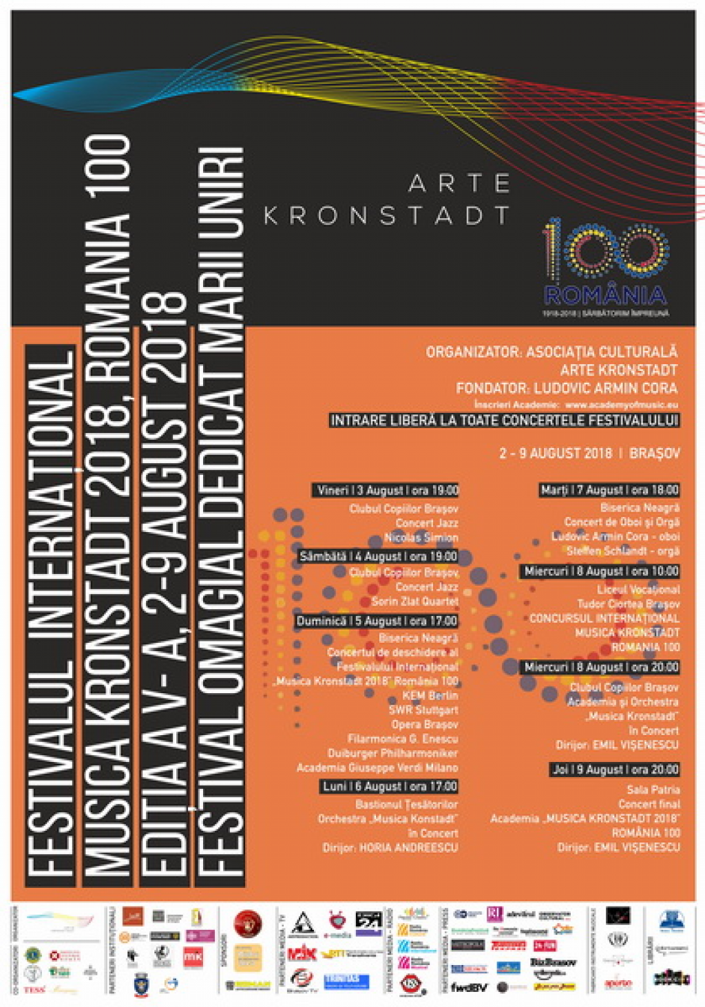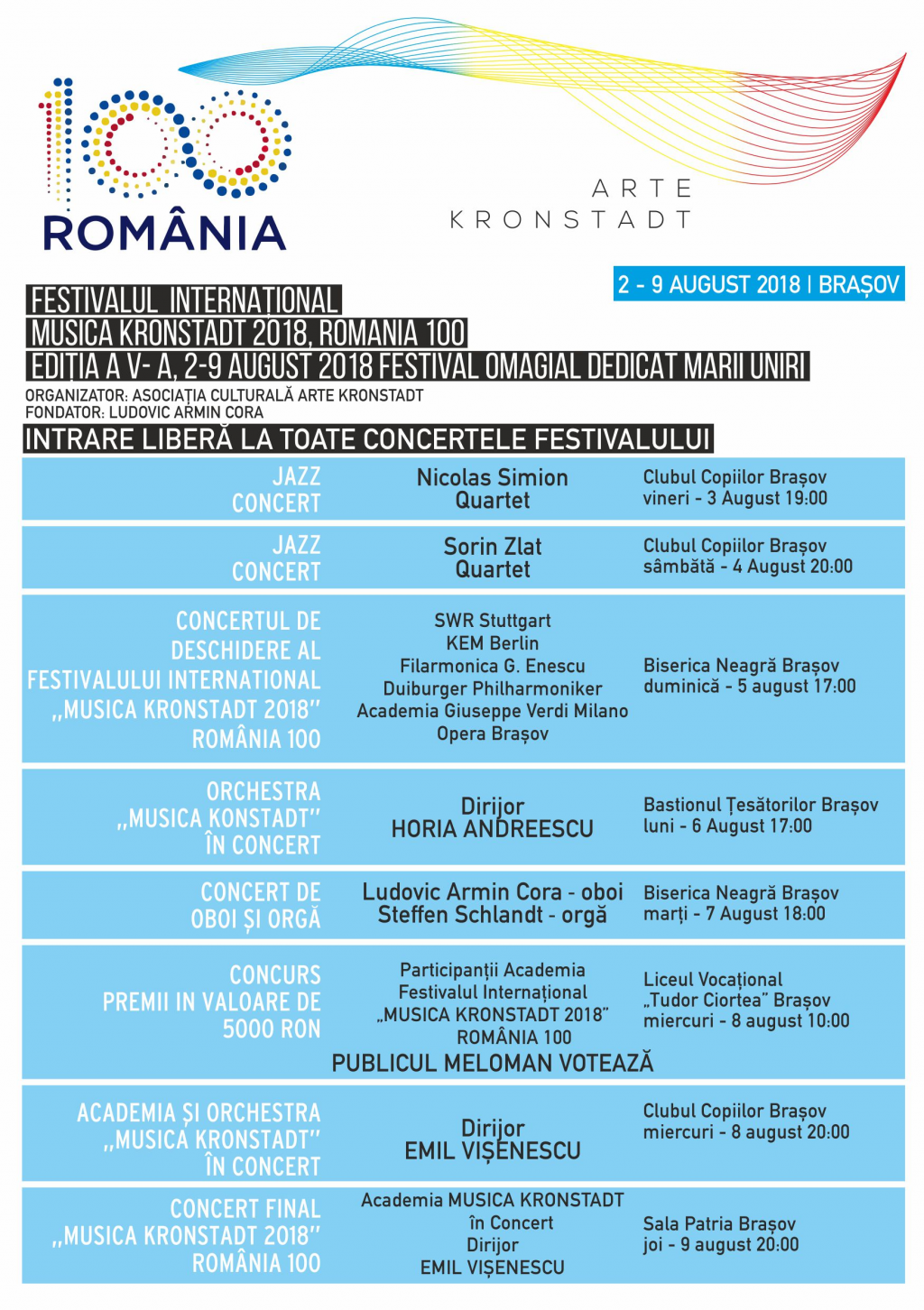 În perioada 2-9 august, ediția a V-a a Festivalului Internațional „Musica Kronstadt 2018” este dedicată Centenarului Marii Uniri. Evenimentul aduce la Brașov elitele muzicii clasice monidale de la Duisburger Philharmoniker, Filarmonica George Enescu, SWR Stuttgart, Conservatorul Giuseppe Verdi - Milano, Ansamblul de Muzică Contemporană din Berlin, Opera Brașov.