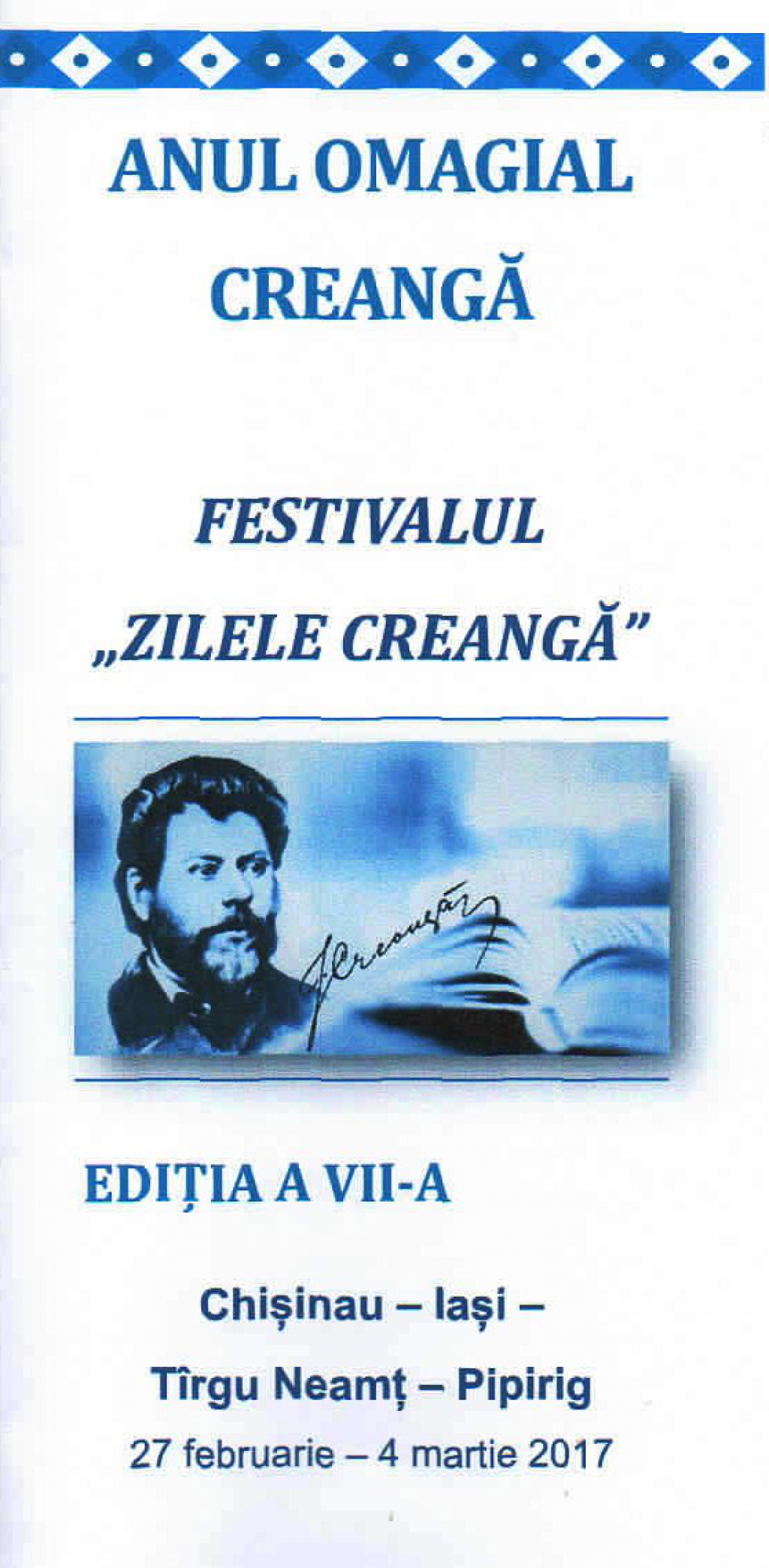 În perioada 27 februarie - 4 martie 2017, se vor desfășura manifestările  Festivalului „Zilele Creangă", ediția a VII-a, în Chișinău, Iași, Târgu-Neamț și Pipirig.