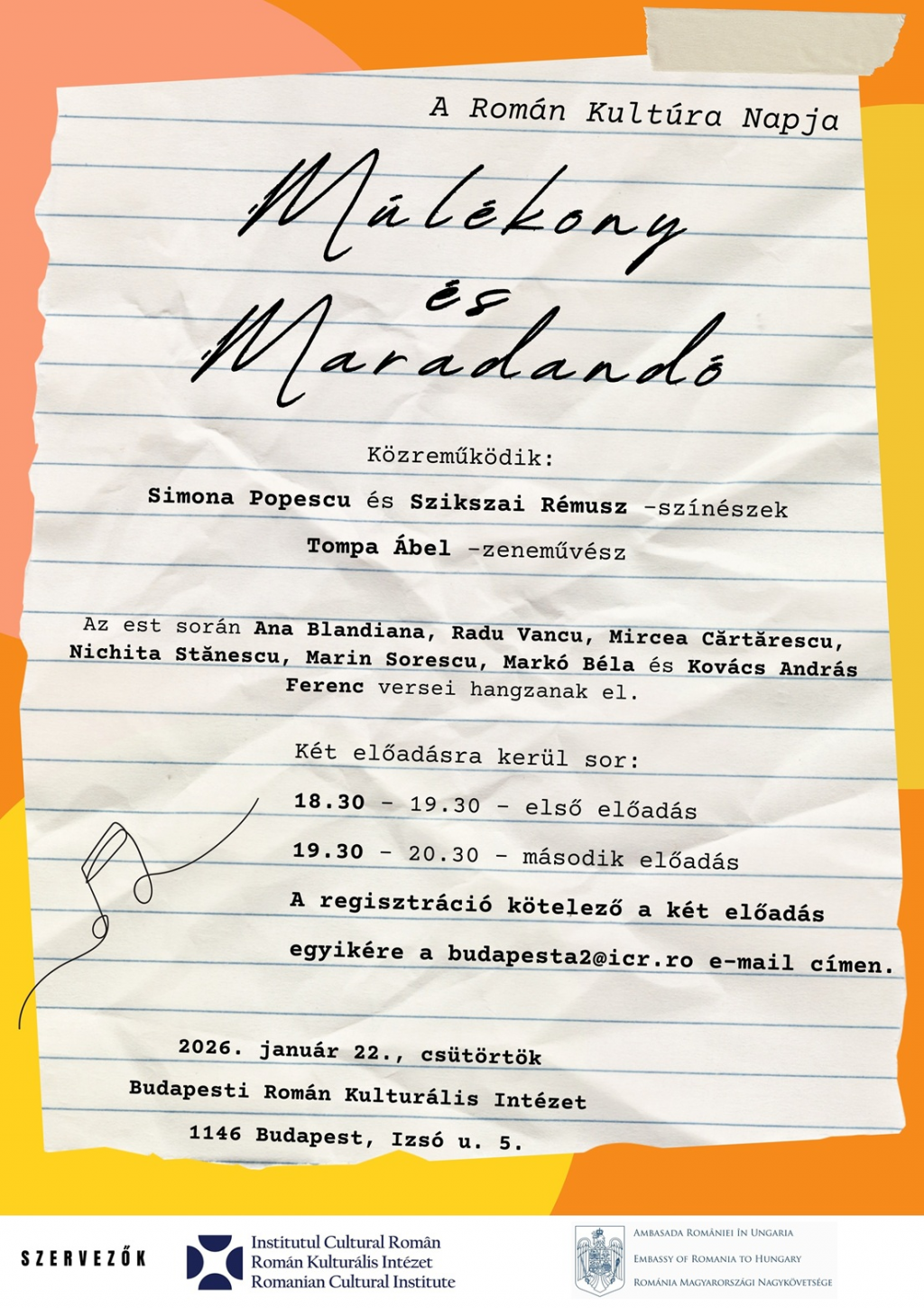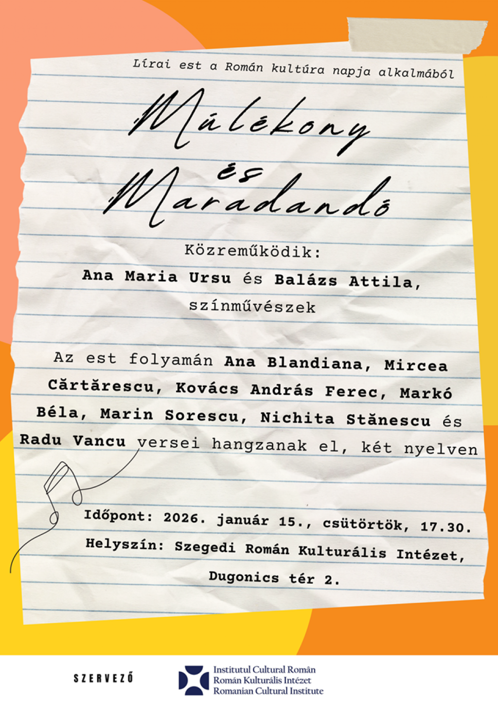 Institutul Cultural Român de la Budapesta și Filiala sa de la Seghedin marchează Ziua Culturii Naționale prin proiectul interdisciplinar „EFEMER_NON EFEMER: Între literatură și teatru”, prezentat publicului în două variante de interpretare. Seria evenimentelor debutează la Seghedin, în data de 15 ianuarie. Protagoniști vor fi actorii Balázs Attila și Ana Maria Ursu, care vor susține un recital de poezie. Proiectul continuă la Budapesta pe 22 ianuarie, în Galeria ICR, unde conceptul va căpăta accente muzicale. Actorii Simona Popescu și Szikszai Rémusz vor lectura versurile, fiind acompaniați de pianistul Tompa Ábel și cvartetul condus de acesta. Intermezzo-urile muzicale vor include prelucrări din „22 teme de jazz” de Johnny Răducanu. Selecția literară, comună ambelor evenimente, reunește texte semnate de autori de referință din literatura română și maghiară: Ana Blandiana, Radu Vancu, Mircea Cărtărescu, Nichita Stănescu, Marin Sorescu, Markó Béla și Kovács András Ferenc.