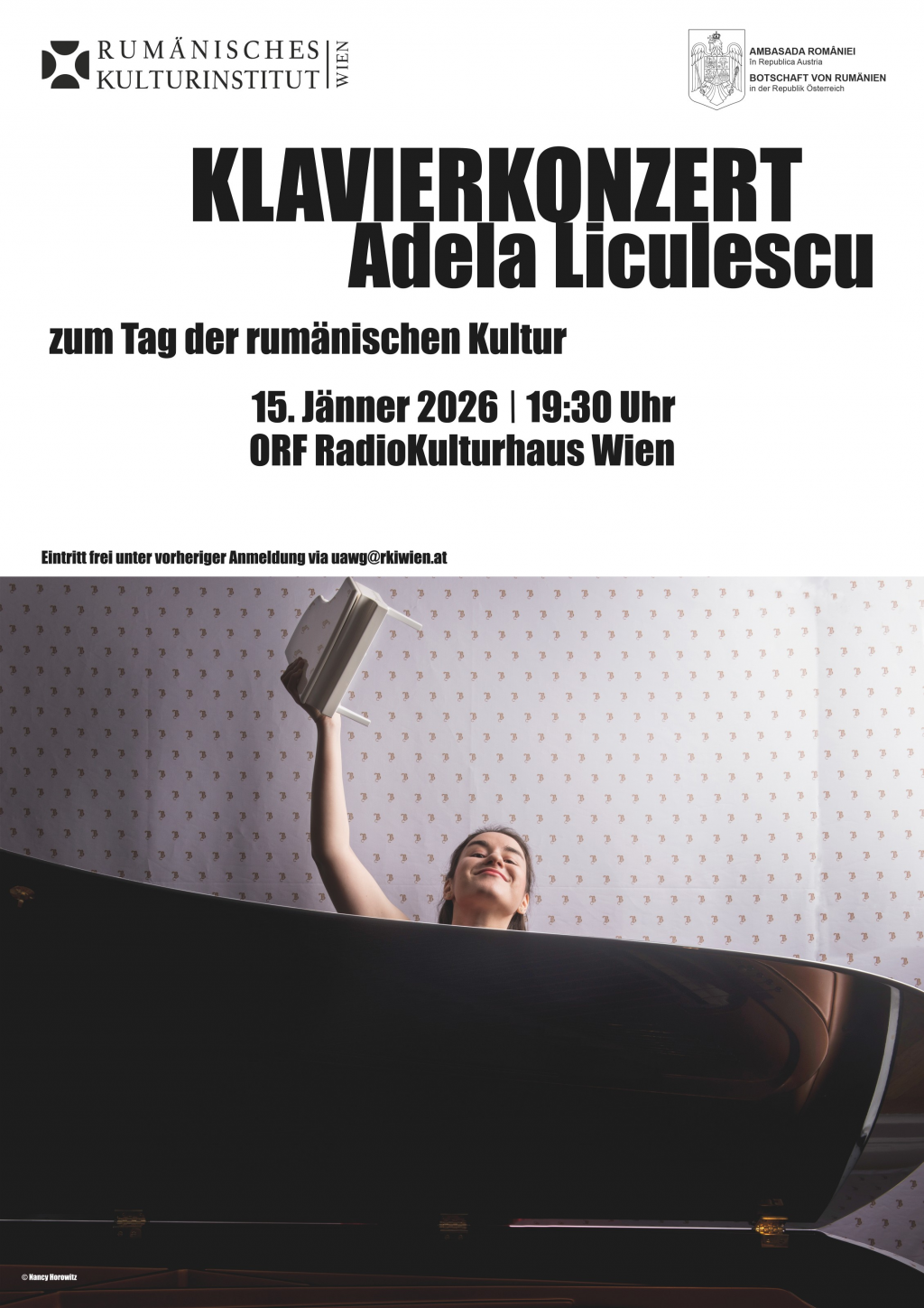 Institutul Cultural Român de la Viena organizează, în colaborare cu Ambasada României în Republica Austria și ORF Rundfunkhaus, un recital de pian susținut de Adela Liculescu. Concertul va avea loc la Sala Mare a Radioului Austriac, în data de 15 ianuarie. Recitalul se deschide și se încheie cu două lucrări de George Enescu: Suita op. 10 pentru pian și Rapsodia română nr. 1 ,în partea centrală fiind interpretate compoziții semnate de Paul Constantinescu, Carl Filtsch – copil-minune născut la Sebeș în 1830,Tudor Dumitrescu – alt copil-minune al României, al cărui destin s-a încheiat tragic la vârsta de 19 ani, în cutremurul din 1977 – și Nicolae Kirculescu, compozitor român cunoscut mai ales pentru muzica ușoară și de film. Adela Liculescu va concerta ulterior la Sala Muzeului Hallwyl din Stockholm, în cadrul evenimentului organizat de ICR Stockholm, în data de 19 ianuarie, în colaborare cu Ambasada României în Regatul Suediei.