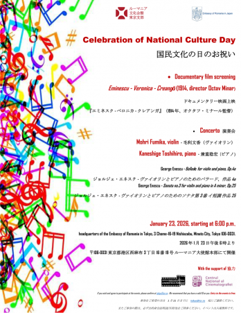 Institutul Cultural Român de la Tokyo organizează în data de 23 ianuarie 2026, la sediul Ambasadei României din Japonia, proiecția filmului documentar Eminescu – Veronica – Creangă (1914), regia Octav Minar, și un recital de muzică de cameră susținut de Mohri Fumika (vioară) și Kaneshige Toshihiro (pian), care au ales să interpreteze lucrări de George Enescu. Evenimentul este organizat în parteneriat cuAmbasada României în Japonia, Centrul Național al Cinematografiei din România și Arhiva Națională de Filme – Cinemateca Română. Documentarul românescEminescu – Veronica – Creangă a fost produs în 1914 de filiala din Bucureşti a casei „Pathé”.