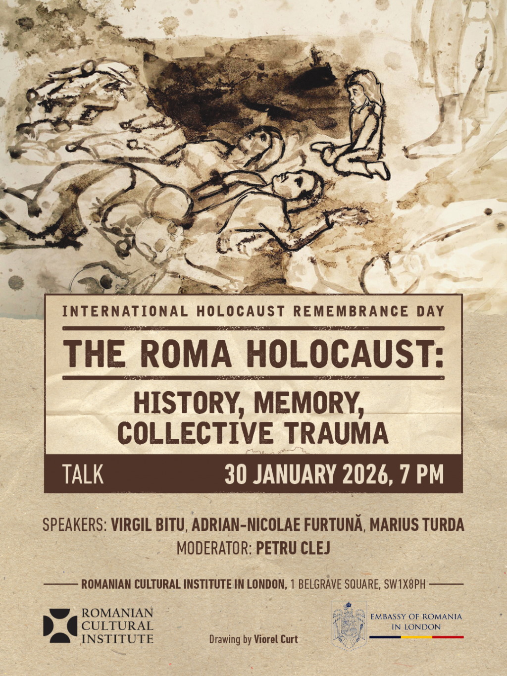 Institutul Cultural Român de la Londra și Ambasada României la Londra propun proiectul „Holocaustul împotriva romilor“ – o masă rotundă urmată de prezentarea volumului Holocaustul împotriva Romilor: album de memorie și recunoștință – în data de 30 ianuarie 2026, la sediul ICR Londra. În cadrul evenimentului dedicat Zilei Internaționale de Comemorare a Victimelor Holocaustului vor susține prelegeri prof. Marius Turda (Oxford Brookes University, interesat de documentarea eugeniei, rasismului și Holocaustului), istoricul și sociologul Adrian Nicolae Furtună (Centrul de Cercetări Culturale și Sociale ,,Romane Rodimata“, specializat în istoria și memoria romilor, inclusiv sclavia și Holocaustul romilor) și activistul Virgil Bitu (Asociația ROTA – Roma Organisation for Training and Advocacy, Marea Britanie, dedicat drepturilor romilor), care ulterior vor dialoga în cadrul unei dezbateri moderate de jurnalistul Petru Clej. Un element aparte al evenimentului constă în prezentarea volumului Holocaustul împotriva Romilor: album de memorie și recunoștină, Adrian Nicolae Furtună fiind unul dintre semnatarii volumului. Partener: Departamentul pentru Relații Interetnice al Guvernului României.