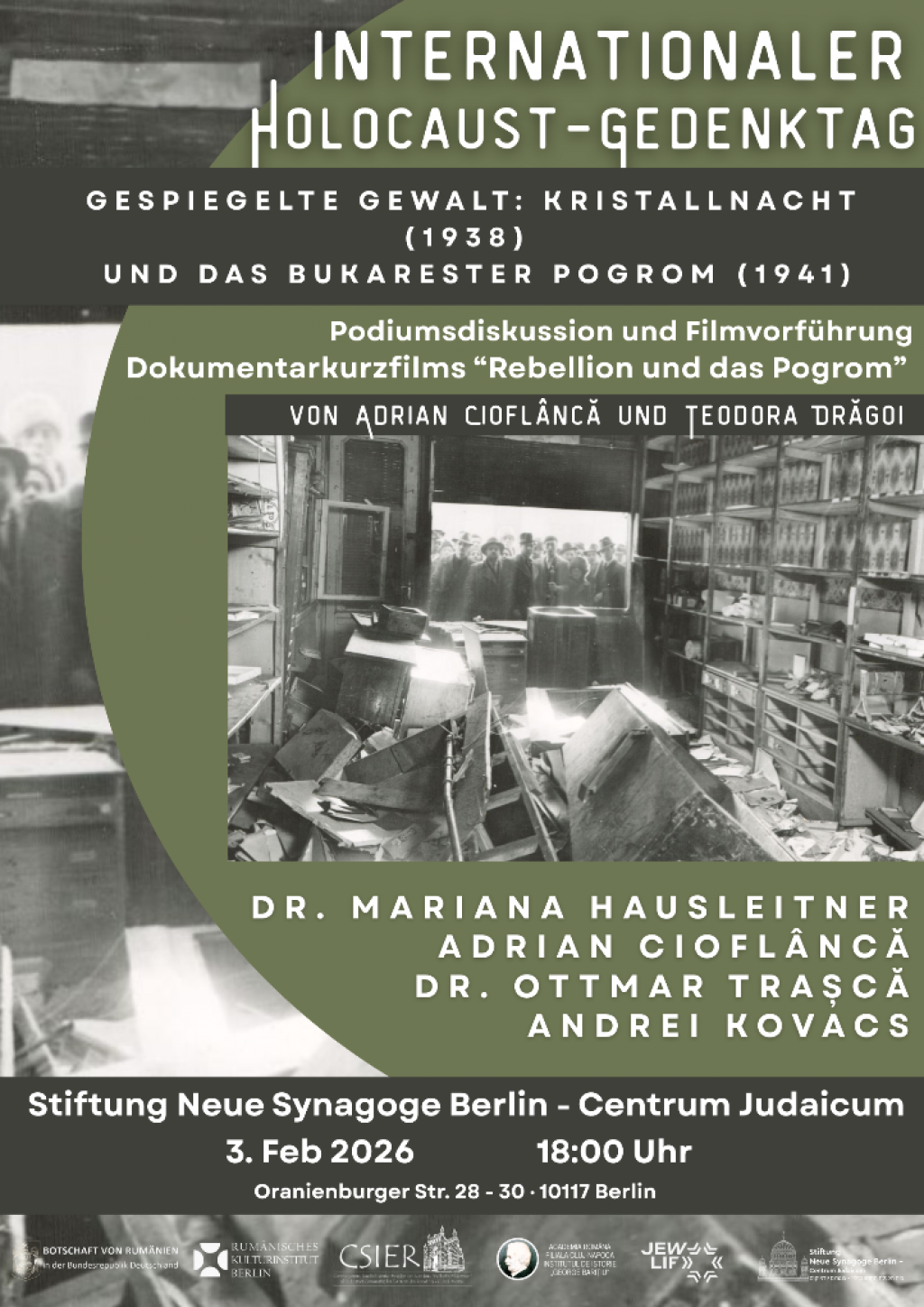Institutul Cultural Român „Titu Maiorescu” din Berlin, în colaborare cu Ambasada României în Republica Federală Germania, organizează în data de 3 februarie 2026, la Neue Synagoge Berlin – Centrum Judaicum, dezbaterea „Violență oglindită: Kristallnacht (1938) și Pogromul de la București (1941)“ și proiecția, în premieră în Germania, a documentarului Rebeliunea și Pogromul, produs de Televiziunea Română în 2026, realizatori Adrian Cioflâncă și Teodora Drăgoi. Evenimentul îi va avea ca invitați pe Adrian Cioflâncă, istoric, director al Centrului pentru Studiul Istoriei Evreilor din România „Wilhelm Filderman”; Ottmar Trașcă, istoric, Institutul de Istorie „George Barițiu” al Academiei Române; Mariana Hausleitner, istoric și lector universitar; Andrei Kovacs, președintele Asociației „Jüdisches Leben in Europa“. Documentarul este produs de Redacția Alte Minorități din cadrul TVR (producător Boris Velimirovici), printr-o colaborare între redactorul-șef al biroului, Teodora Drăgoi, și istoricul Adrian Cioflâncă, specialist în istoria Holocaustului. Parteneri: Centrul pentru Studiul Istoriei Evreilor din România „Wilhelm Filderman”, Institutul de Istorie „George Barițiu” al Academiei Române, Asociația „Jüdisches Leben in Europa” și Neue Synagoge Berlin – Centrum Judaicum.
