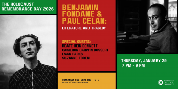Evenimentul „Benjamin Fondane și Paul Celan – literatură, memorie și exil” din 29 ianuarie 2026, la Sala „Norman Manea” a Institutului Cultural Român de la New York este dedicat vieții și operei celor doi scriitori evrei de origine română. Prof. Evan Parks, de la Columbia University, specialist în literatură și studii culturale, va oferi, în calitate de keynote speaker, o prezentare axată pe contextul istoric, intelectual și literar al operelor lui Benjamin Fondane și Paul Celan, cu accent pe temele memoriei, exilului și traumei istorice. Programul va include lecturi publice de fragmente selectate din operele celor doi autori, susținute de actorii Cameron Darwin Bossert și Suzanne Toren. Selecția textelor este realizată de regizoarea Beate Hein Bennett, cu scopul de a ilustra relevanța estetică și etică a creației literare a celor doi scriitori în contextul Holocaustului și al literaturii postbelice.
