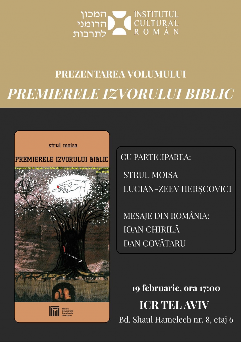 La sediul Institutului Cultural Român de la Tel Aviv va fi prezentat joi, 19 februarie 2026, ora 17:00, volumul „Premierele izvorului biblic”, autor Strul Moisa. Evenimentul îi va avea ca invitați pe autorul volumului, Strul Moisa, dr. ing. la Universitatea „Ben Gurion” din Negev, Beer Sheva, alături de dr. Lucian-Zeev Herșcovici, istoric israelian de origine română. Lansarea acestui volum reprezintă un prilej de promovare și sprijinire a cercetării științifice, precum și de accentuare a importanței și continuității relațiilor bilaterale dintre România și Israel.