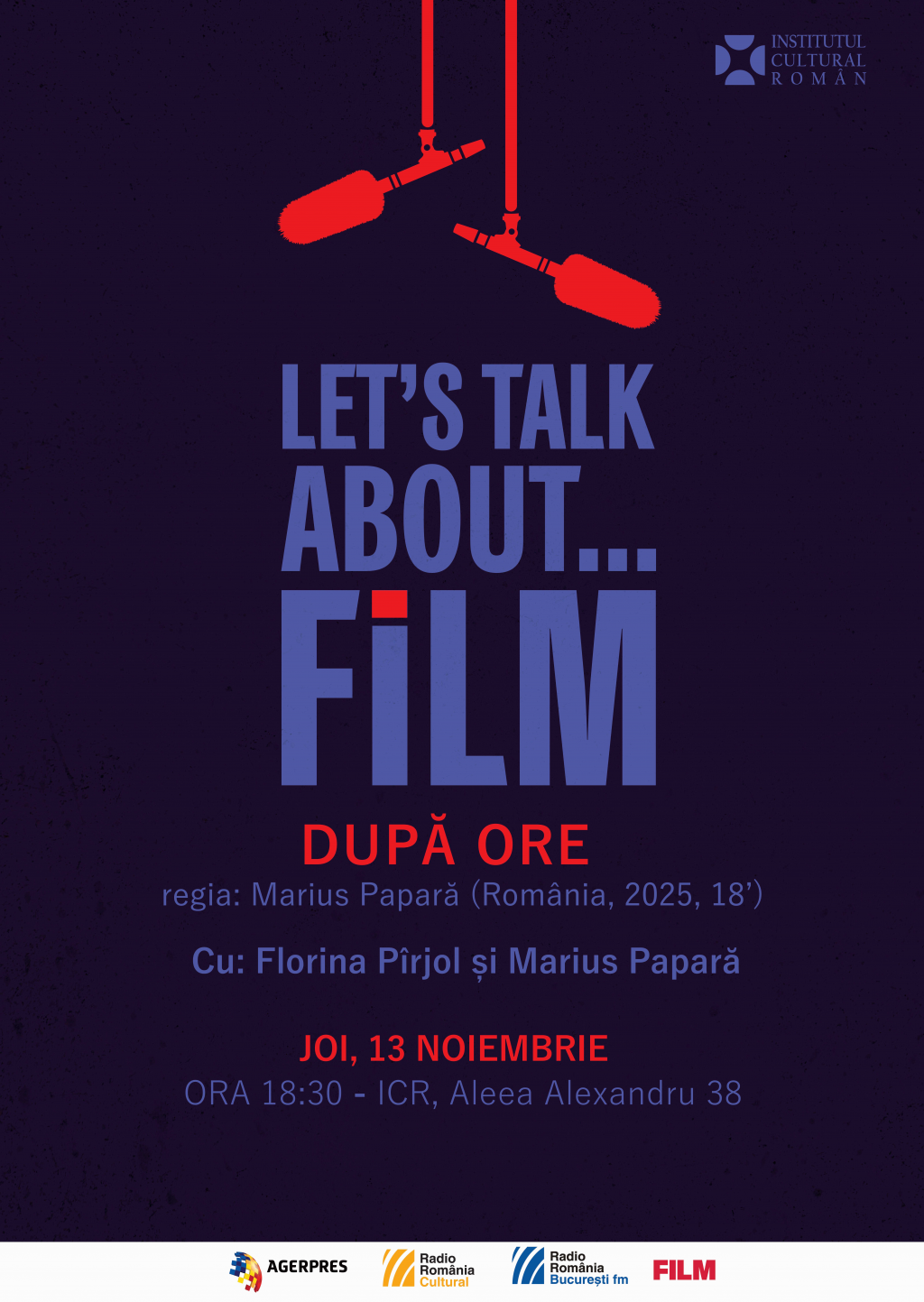 Joi, 13 noiembrie, de la ora 18:30, Institutul Cultural Român propune, la sediul său din Aleea Alexandru 38, o nouă întâlnire din seria de evenimente „Let's Talk About...Film”. Cu această ocazie, va fi proiectat filmul românesc „După ore” (2025, 18') regizat de Marius Papară, proiecție care va fi urmată de un dialog între regizor și scriitoarea Florina Pîrjol. Intrarea la eveniment este liberă, în limita locurilor disponibile.