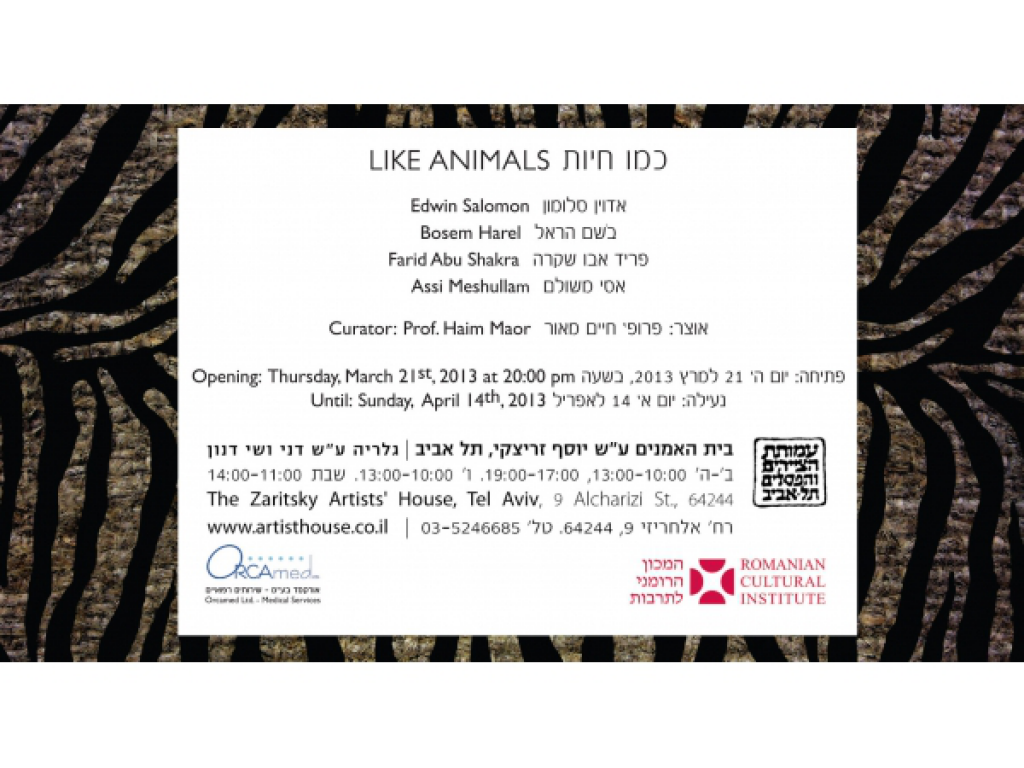 În perioada 21 martie – 12 aprilie 2013, la Casa Artiștilor din Tel Aviv va avea loc expoziția „Like Animals”, ce cuprinde lucrări de pictură și sculptură din creația recentă a patru artiști israelieni: Edwin Salomon (originar din România), Bosem Harel, Farid Abu Shakra și Assi Meshullam. Lucrările sunt grupate sub un concept unitar, artiștii utilizând cu predilecție imagistica zoomorfă pentru a explora vizual diverse stereotipuri legate de regnul animal.