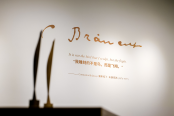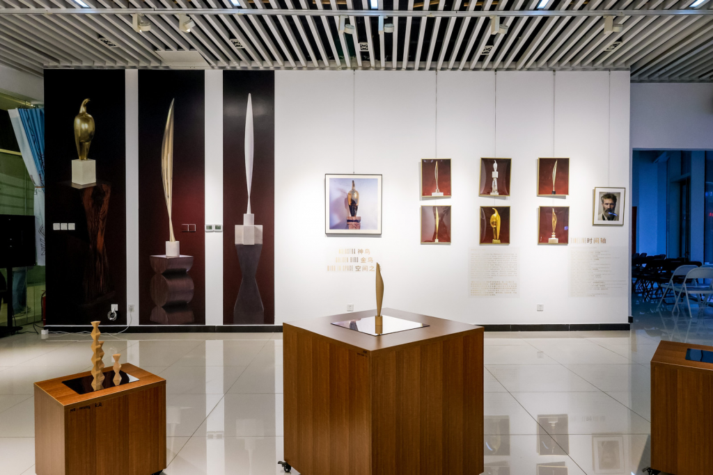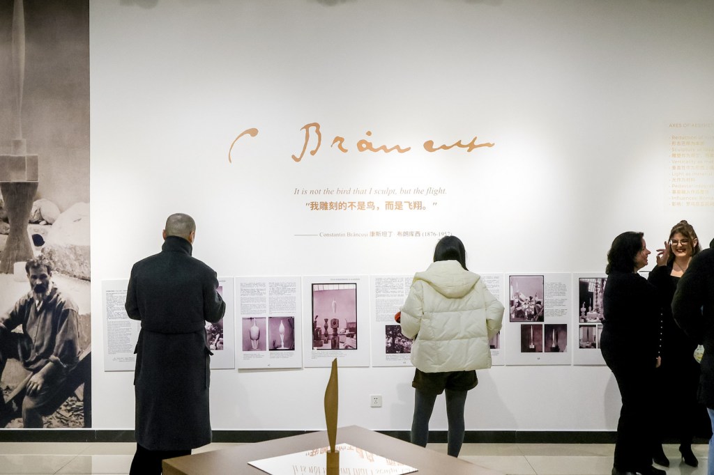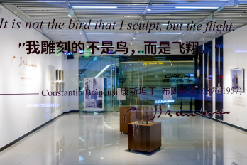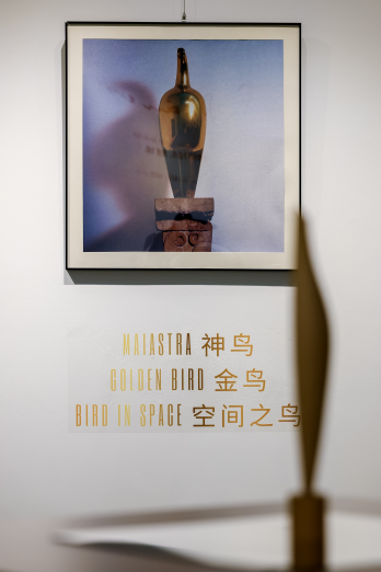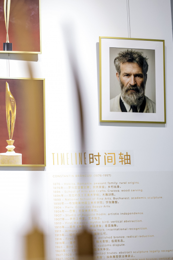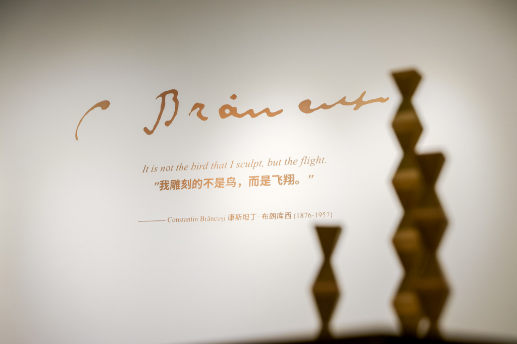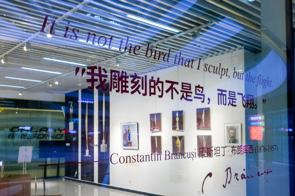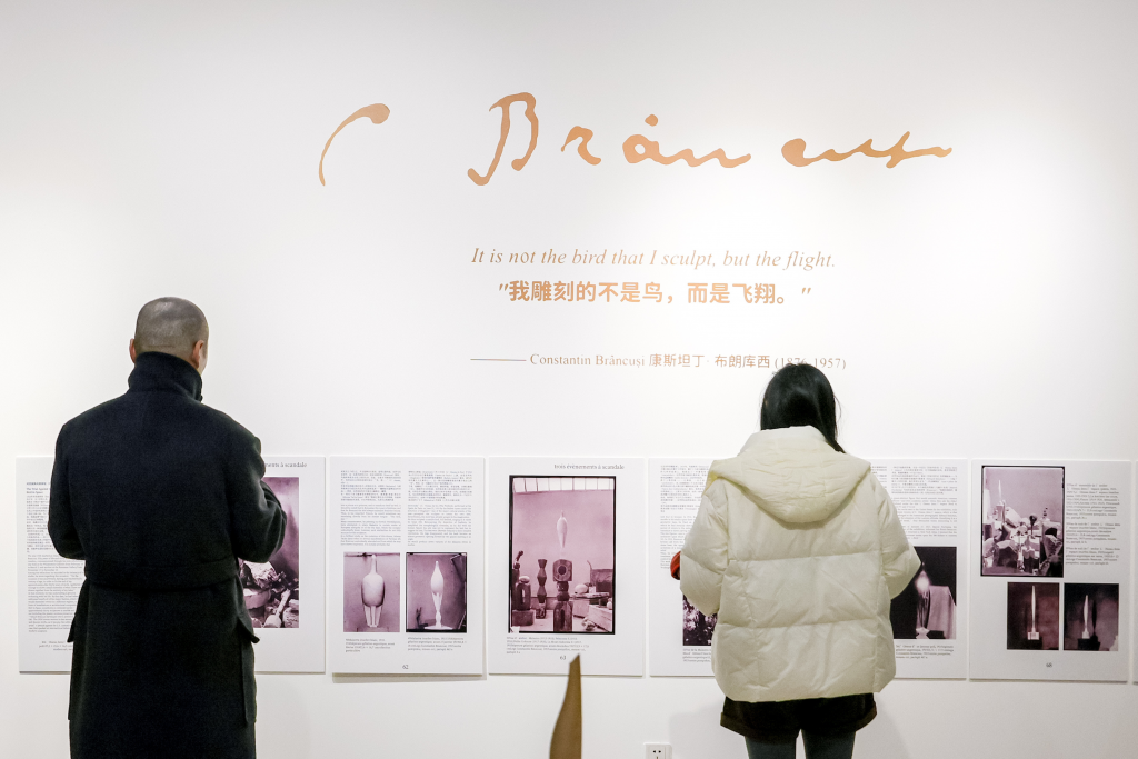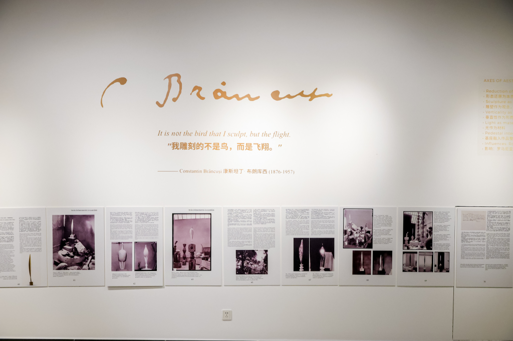 The exhibition structure includes a bilingual documentary wall installation (Chinese–English) integrating several thematic layers: the aesthetic chronology of the artist’s biography; the contextualization of the Bird series within the broader economy of Brâncuși’s oeuvre; a listing of major works and the museums that hold them; an analysis of the legal episode that took place in the Port of New York (the 1926–1928 trial concerning the status of Bird in Space, a defining moment for the recognition of modern sculpture in the United States); reproductions from period newspapers and documentary images; sketches illustrating the process of formal essentialization; and references to the commission created in the 1930s for Maharajah Yeshwant Rao Holkar of Indore (India), for whom Brâncuși executed two marble versions of the Bird in Space cycle intended for the Maharajah’s palace.