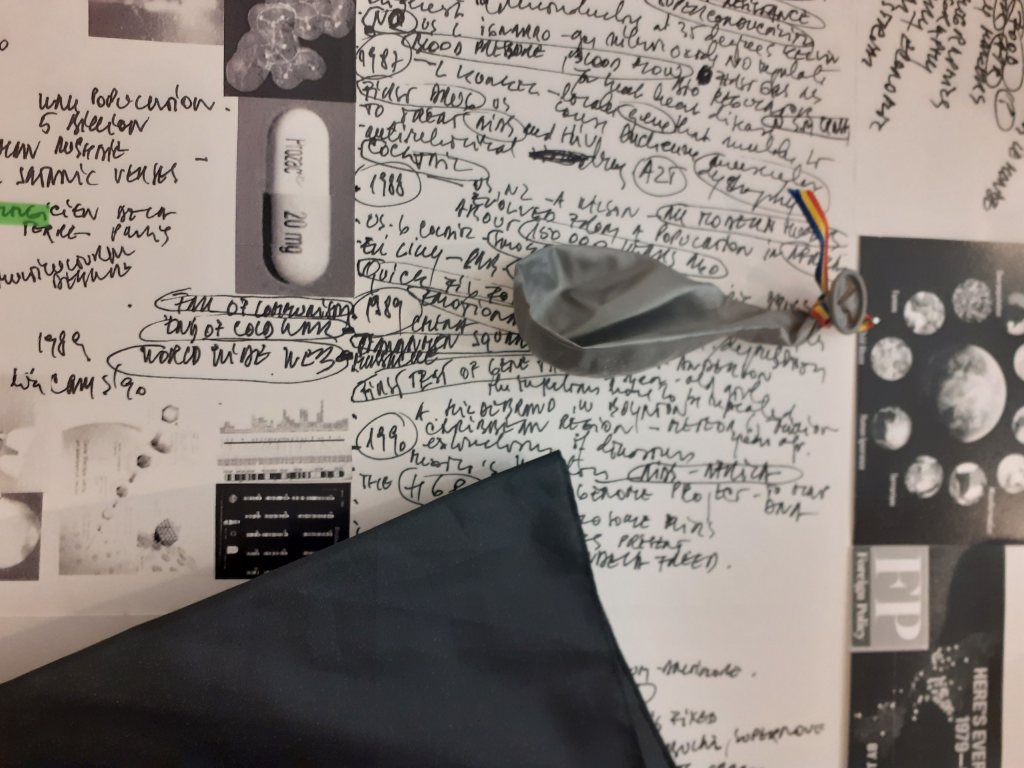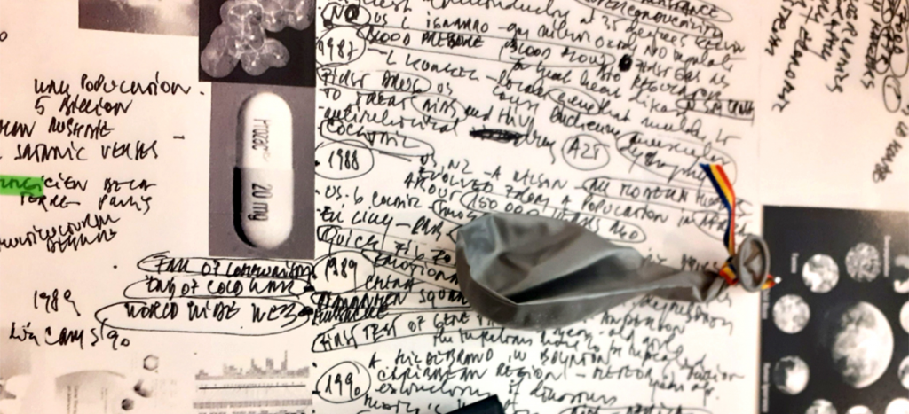 Universul Liei Perjovschieste fragmentat, cu simboluri diferite, de la umbrele la diagrame. „Am adus cu mine în valize un muzeu imaginar, după cum spunea André Malraux. E important să înţelegem lumea mai bine în ansamblu, noi suntem antrenaţi să vedem detalii din experienţă. Folosesco cronologie de cultură generală, aduc elemente din viaţa de zi cu zi. Am creat, pe câţiva pereţi, o cronologie a artei contemporane de la modernism până azi, cu diagrame, fotografii luate de pe Facebook, vederi de prin muzeele lumii. Am şi un balon gri, dezumflat, cu tricolorul, kituri de emigrare şi de încălzire globală. Am departamente cu referinţe la pământ, artă, cultură, univers, ştiinţă, cunoaşterea de azi şi un puzzle cu toată instalaţia”, a spus Lia Perjovschi.