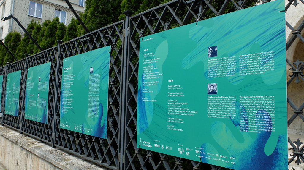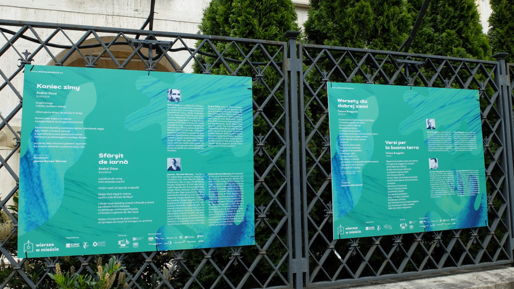 Expoziția în aer liber „Poezia în oraș/Poems in the City”, în cadrul proiectului cu același nume organizat de EUNIC Varșovia – Asociația Institutelor Naționale pentru Cultură ale Uniunii Europene, în colaborare cu Primăria Varșoviei, Reprezentanța Comisiei Europene în Polonia și Asociația Traducătorilor Literari, a fost inaugurată la Varșovia, la 11 mai 2020.