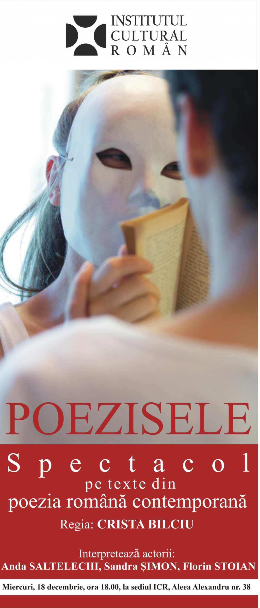 Miercuri, 18 decembrie, de la ora 18.00, la Institutul Cultural Român (Aleea Alexandru 38) va avea loc o reprezentație a spectacolului POEZISELE, regizat de Crista Bilciu.