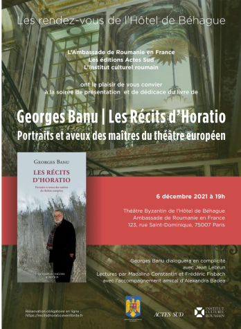 Cunoscutul dramaturg George Banu va prezenta, luni, 6 decembrie 2021, „Povestirile lui Horatio” / «Les Récits d’Horatio», în dialog cu prietenul său, Jean Lebrun, jurnalist Radio France Inter.