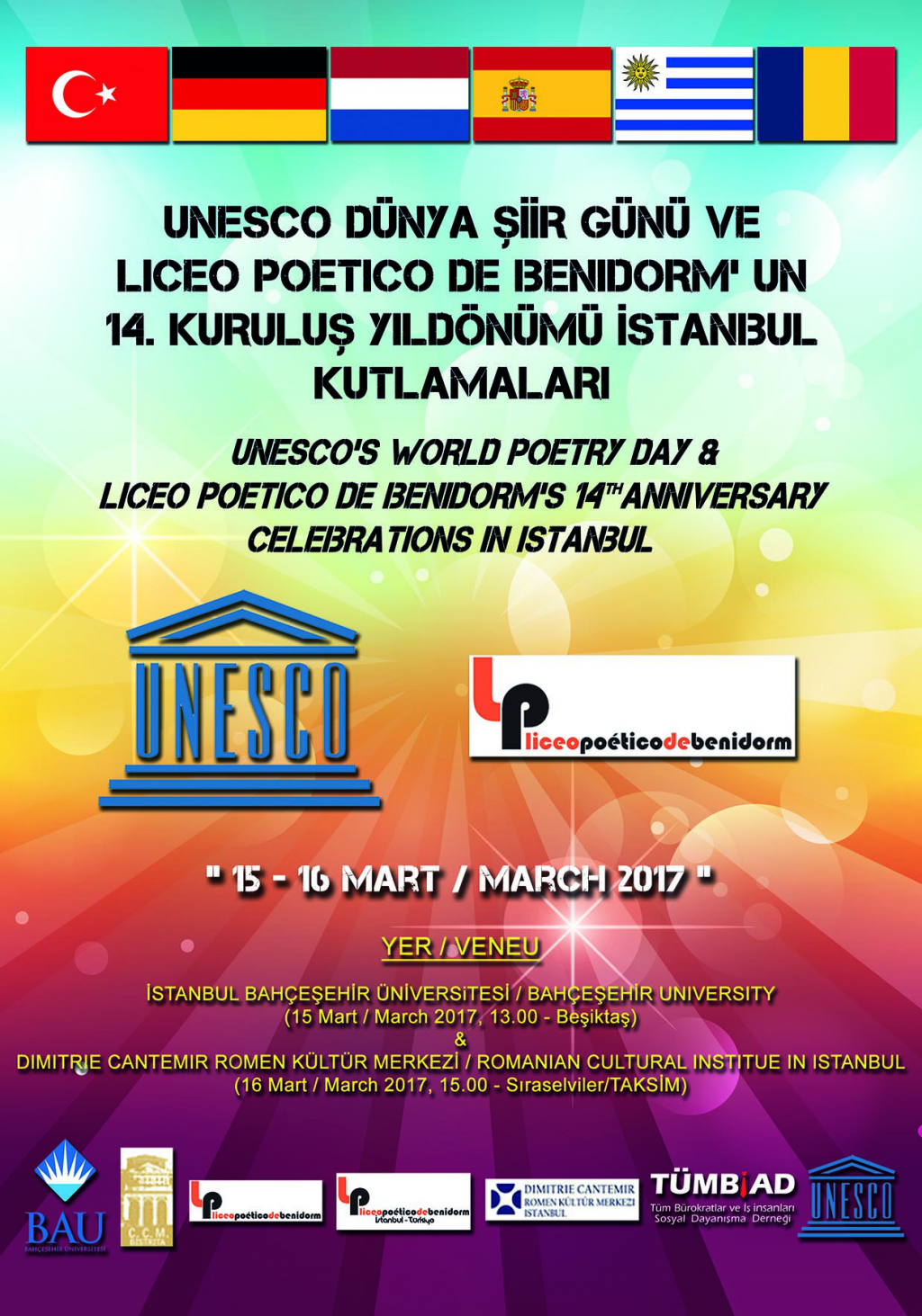 Institutul Cultural Român „Dimitrie Cantemir” de la Istanbul sprijină prezența scriitorilor români Dorel Cosma, Menuț Maximinian și Zorin Diaconescu la festivalul Ziua Internațională a Poeziei (UNESCO) și la cea de-a XIV-a aniversare a Liceo Poético de Benidorm. Evenimentul se va desfășura la Istanbul în perioada 14 – 17 martie 2017. România este prezentă la festival ca urmare a invitației primite din partea Asociației Liceo Poético de Benidorm din Turcia.