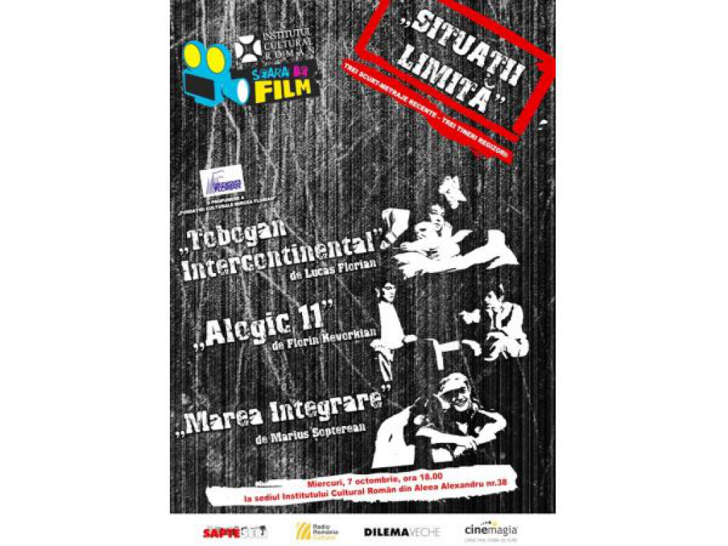 Miercuri, 7 octombrie, începând cu ora 18.00, la sediul ICR (Aleea Alexandru 38), în cadrul programului SEARA DE FILM, vor fi proiectate scurtmetrajele Tobogan intercontinental în regia lui Lucas Florian, Alogic 11 în regia lui Florin Kevorkian şi Marea integrare în regia lui Marius Şopterean. Evenimentul este organizat de ICR împreună cu Fundaţia Culturală "Mircea Florian".