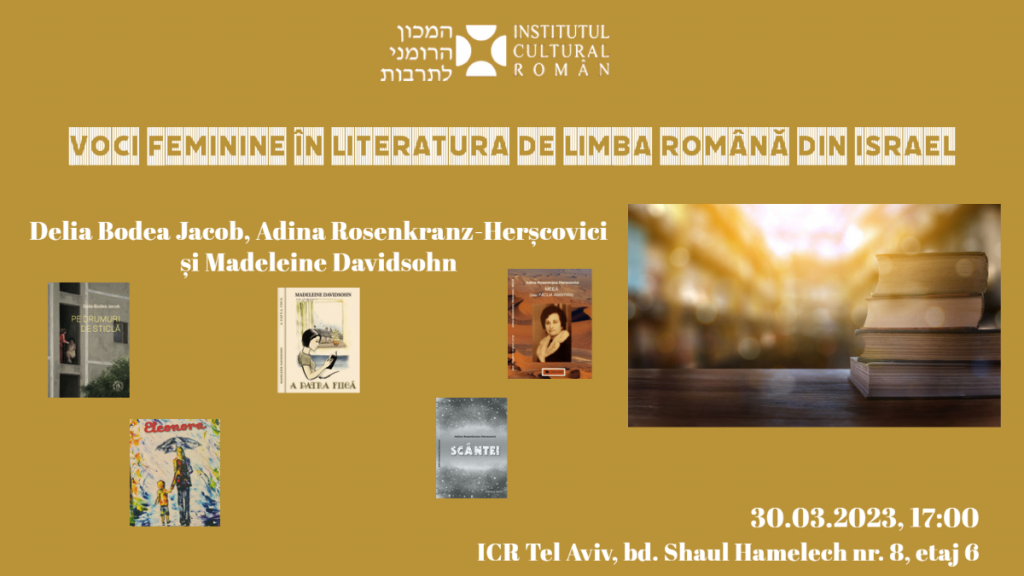 Un nou episod din seria „Voci feminine în literatura israeliană de limbă română” va avea loc joi, 30 martie 2023, ora 17.00, la sediul ICR Tel Aviv, pentru a celebra Ziua Internațională a Femeii. Cu această ocazie, vor fi prezentate operele a trei scriitoare: Delia Bodea Jacob, Adina Rosenkranz-Herșcovici și Madeleine Davidsohn, membre ale Asociației Scriitorilor Israelieni de Limba Română.