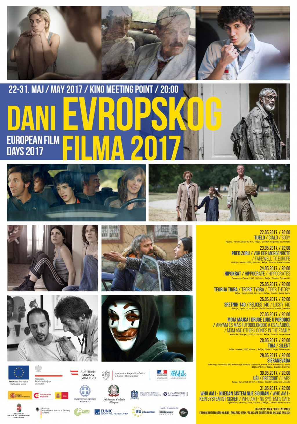 Zilele Filmului Europeanse deşfăşoară până pe 31 mai 2017 la Meeting Point Cinema din Sarajevo, fiind organizate de membri ai clusterului EUNIC Bosnia și Herțegovina şi EU Info Centre Bosnia și Herțegovina. Din program fac parte producții cinematografice din Austria, Cehia, Franţa, Germania, Grecia, Italia, Polonia, România, Spania şi Ungaria. Institutul Cultural Român de la Viena este membru în clusterul EUNIC Bosnia și Herțegovina începând cu luna mai 2016.