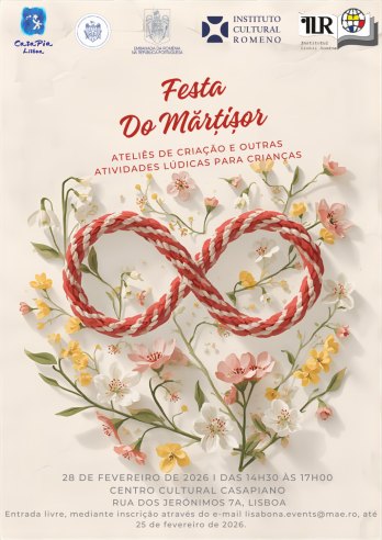 Institutul Cultural Român de la Lisabona, alături de Ambasadele României și Republicii Moldova în Republica Portugheză, organizează Sărbătoarea Mărțișorului sâmbătă, 28 februarie 2026, orele 14.30-17.30, la sediul Centrului Cultural Casapiano. Cu sprijinul prof. Elena Covasan, care predă Cursul de Limbă și Civilizație Românească, program al Institutului Limbii Române, vor fi organizate ateliere în cadrul cărora va fi prezentată povestea Mărțișorului. Copiii îşi vor confecționa mărțișoare reciclabile, din hârtie, pastă rece sau materiale textile. În cadrul atelierului „Marioneta Mărțișorului – O călătorie între România și Portugalia”, copiii vor confecționa marionete în specificul portului popular românesc și tradițiilor de primăvară. Proiectul include diferite momente artistice, un atelier de pictură facială pentru copii, precum și sesiuni de prezentare a tehnicilor de broderie populară și String Art.