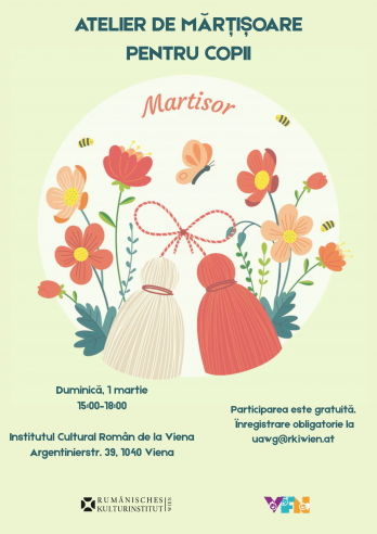 Institutul Cultural Român de la Viena găzduiește un workshop dedicat copiilor din comunitatea de români. Intitulat „Mărțișorul, tradiție și frumusețe românească”, va avea loc pe 1 martie 2026, în intervalul orar 15.00-18.00, în biblioteca ICR Viena. Activitățile includ confecționarea de mărțișoare și de brățări din mărgeluțe pe fir roșu și o scurtă prezentare despre tradiția Mărțișorului. Atelierul este coordonat de Cosmina Efremescu și Claudia Chezan, voluntare în Vienna Family Network și coordonatoare ale Grupului de Limbă Română din cadrul organizației. Publicul interesat este invitat, între 27 februarie și 1 martie, și la Târgul de Mărțișoare(Bruno-Marek-Allee 9, 1020, Viena), organizat în colaborare cu Biserica Ortodoxă Română Pogorârea Sfântului Duh și Sfântul Ștefan cel Mare din Viena.