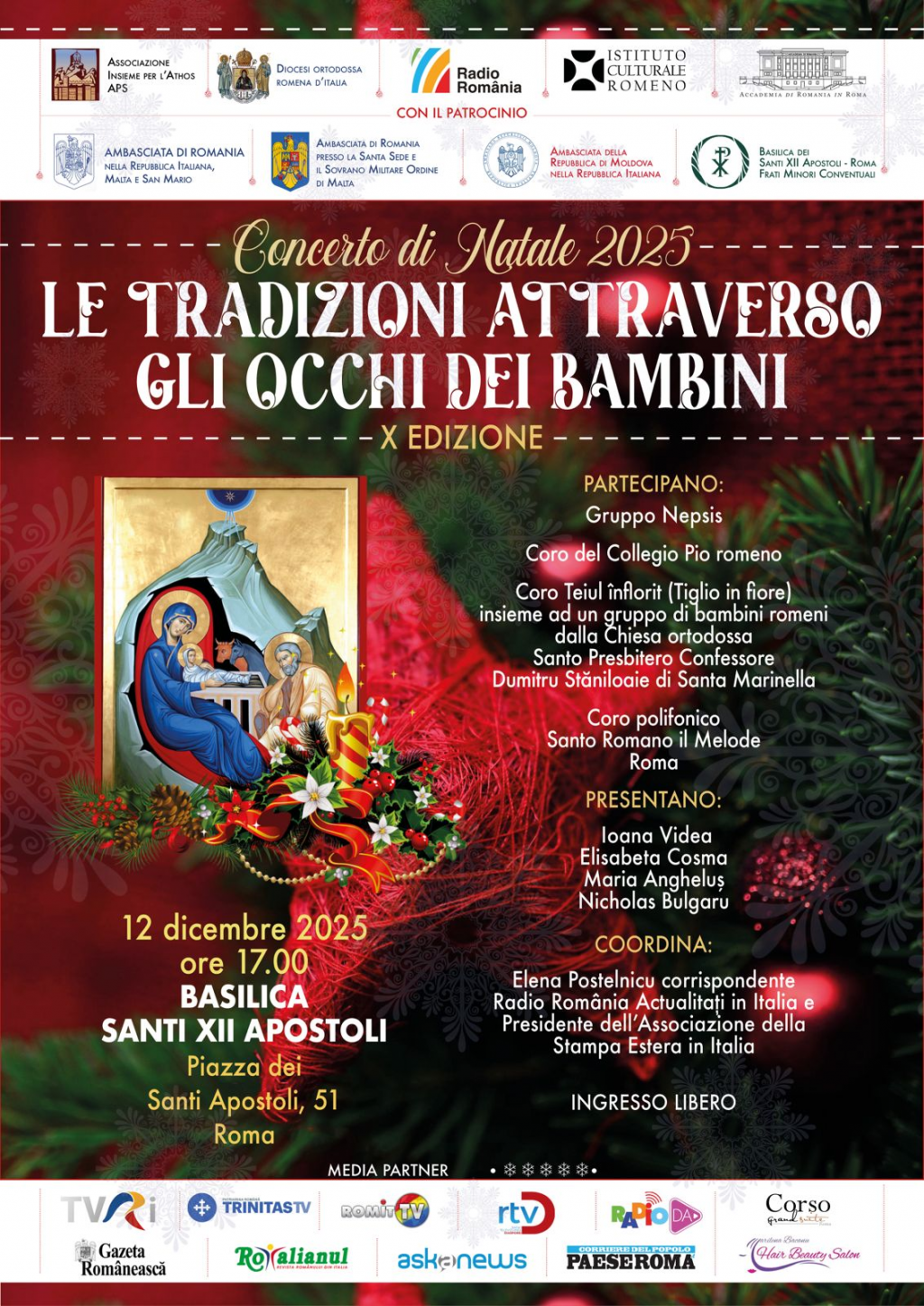 Vă invităm la cea de-a X-a ediție a concertului de colinde românești, care va avea loc vineri, 12 decembrie 2025, de la ora 17.00, la Bazilica Sfinții XII Apostoli (Piazza dei Santi Apostoli 51, Roma). Intitulat, după cum am obișnuit publicul, „Tradiții prin ochi de copii”, concertul este organizat de Asociația „Insieme per Athos”, împreună cu Episcopia Ortodoxă Română din Italia, Accademia di Romania in Roma și Radio România, cu patronajul Ambasadei României în Italia, Ambasadei României la Sfântul Scaun și Ambasadei Republicii Moldova în Italia.