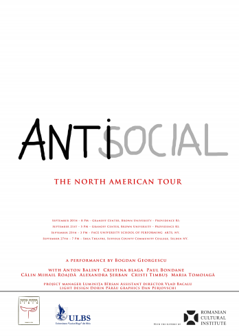 Institutul Cultural Român sprijină turneul Teatrului Național „Radu Stanca" Sibiu în SUA, cu spectacolul Antisocial de Bogdan Georgescu. Reprezentațiile vor avea loc în perioada 20-27 septembrie 2016 în orașele Providence, New York și Selden (SUA), după următorul program: