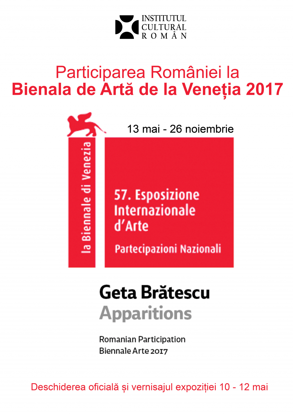 Deschiderea oficială a Bienalei de la Veneția va avea loc în perioada 10 – 12 mai. Vernisajul expoziției din Pavilionul României va avea loc joi, 11 mai, de la ora 17.15,în prezența luiAttila Kim,comisarul României la Bienala de la Veneția, a curatoarei Magda Radu, a CorineiBucea, manager de proiect și a reprezentanților instituțiilor organizatoare,iar în Noua Galerie a Institutului Român de Cultură și Cercetarea Umanistică din Veneția, vineri, 12 mai 2017, de la ora 19.00. Expoziția Geta Brătescu - Apariții are loc în Pavilionul României din Giardini della Biennale și în Noua Galerie a Institutului Român de Cultură şi Cercetare Umanistică de la Veneţia, avându-i autori pe Geta Brătescu, Magda Radu, Corina Bucea, Diana Ursan, Raymond Bobar, Dan Burzo, Frederic Eyl, Steffen Oestreich și Marian Manten.