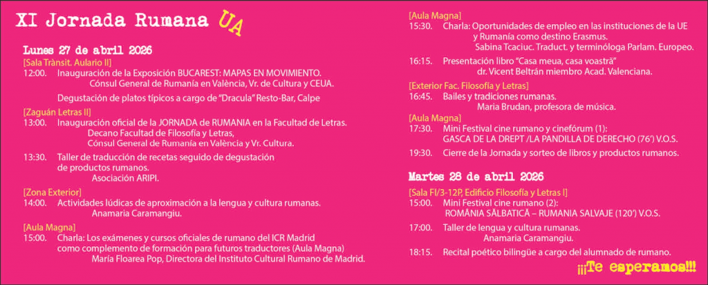 Cea de-a XI a ediție a Zilei dedicate culturii române va avea loc luni, 27 aprilie 2026, la Universitatea din Alicante. Evenimentul academic și cultural dedicat promovării imaginii României și a culturii române este organizat de Consulatul General al României la Valencia, Institutul Cultural Român de la Madrid, în colaborare cu Universiyatea din Alicante si cu Departamentul de Traducere și Interpretare.