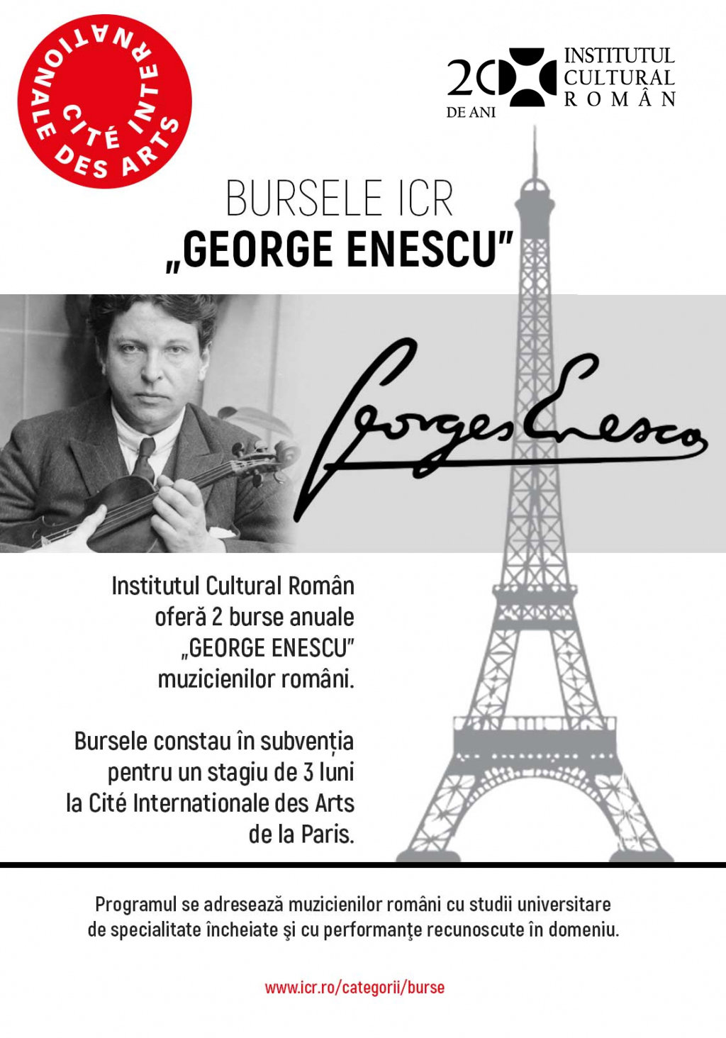 Obiectivul principal al programului de burse „George Enescu“ este introducerea artiştilor români în circuitul valorilor europene, prin oportunitatea de a lucra într-un mediu artistic internaţional. Programul se adresează muzicienilor români cu studii universitare de specialitate încheiate şi cu performanţe recunoscute în domeniu. Sunt oferite anual două burse „George Enescu“ pentru perioade de câte 3 (trei) luni, în vederea desfăşurării unor proiecte artistice în atelierul dedicat României de la Cité Internationale des Arts din Paris. Valoarea fiecărei burse este de 6.000 de euro. Selecţia este făcută de o comisie independentă de specialişti, personalităţi recunoscute în domeniul muzică și muzicologie, pe baza dosarelor de candidatură primite. Criteriile de evaluare suntperformanţa academică a candidaţilor, specializări și masterclassuri, premii naţionale şi internaţionale, calitatea proiectului propus în raport cu locul de desfășurare, performanţa artistică.