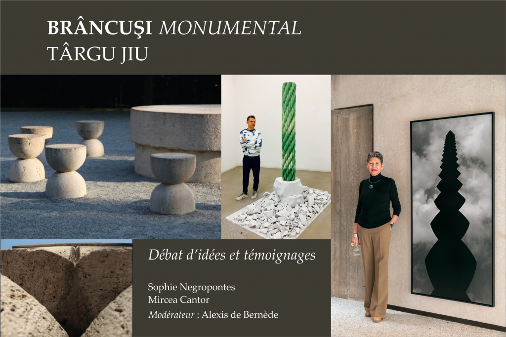 Pentru a sărbători 150 de ani de la nașterea lui Constantin Brâncuși, Institutul Cultural Român de la Paris, în parteneriat cu Ambasada României în Republica Franceză, Consulatul General al României la Paris, Delegația Permanentă a României la UNESCO, artistul Mircea Cantor și Galeria Negropontes, prezintă expoziția în aer liber Brâncuși Monumental Târgu Jiu (15 februarie -22 noiembrie 2026), amplasată pe zidul exterior al grădinii Palatului Béhague, Reședința României în Franța, la adresa 24–26 Avenue Bosquet, 75007 Paris și organizează, în 19 februarie, ora 18:30, vernisajul expoziției și dialogul dintre artistul Mircea Cantor și Sophie Negropontes, fondatoarea și directoarea generală a Galeriei Negropontes din Paris, despre Ansamblului sculptural Brâncuși de la Târgu Jiu și fotografiile Ansamblului realizate de artistul Mircea Cantor și artistul fotograf Dan Er. Grigorescu, tatăl lui Sophie Negropontes.