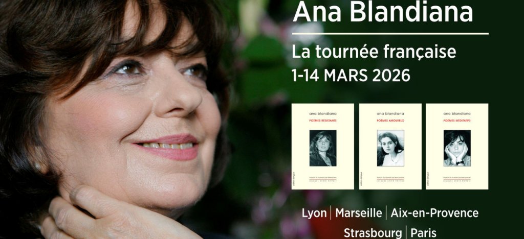 Între 1 și 14 martie 2026, marea poetă româncă Ana Blandiana va efectua un turneu în Franța cu ocazia apariției, în condiții grafice excepționale, a trilogiei apărute la Jacques André Éditeur și care reunește în trei tomuri 8 dintre volumele de poezie ale Anei Blandiana. Acest turneu se înscrie în cadrul festivaluluiPrintemps des Poètes și al evenimentelor prilejuite de Luna Francofoniei.