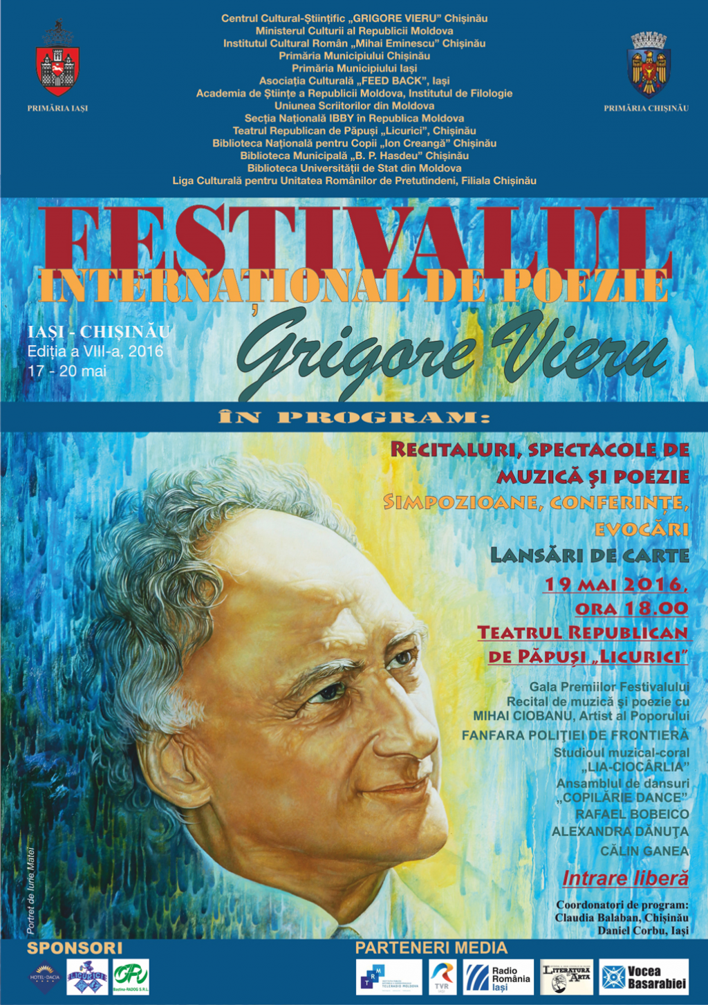 Institutul Cultural Român „Mihai Eminescu" Chişinău, în colaborare cu Ministerul Culturii al Republicii Moldova, Primăria Municipiului Chişinău, Primăria Municipiului Iaşi, Academia de Ştiinţe a Republicii Moldova, Institutul de Filologie, Uniunea Scriitorilor din Moldova, Asociaţia Culturală „Feedback" Iaşi, Teatrul Republican de Păpuși „Licurici", Chişinău, Secţia Naţională IBBY în Republica Moldova, Liga Culturală pentru Unitatea Românilor de Pretutindeni, Filiala Chişinău, Biblioteca Naţională pentru Copii „Ion Creangă", Biblioteca Municipală „B.P. Hasdeu" și Biblioteca Universităţii de Stat din Moldova, organizează în perioada 17-20 mai 2016, la Iaşi și Chişinău, a VIII-a ediție a Festivalului Internaţional de Poezie „GRIGORE VIERU".