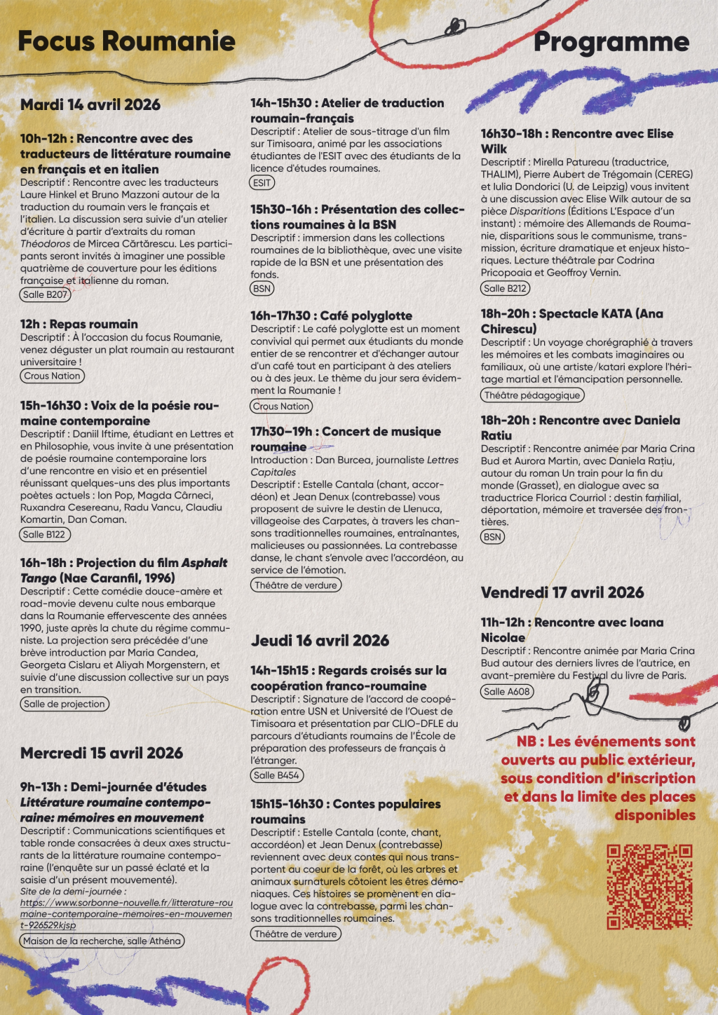 Au programme : rencontres littéraires, ateliers de traduction, débats et tables rondes sur la littérature roumaine ; projection de film ; concert de musique roumaine ; spectacle de danse ; découverte de la poésie roumaine contemporaine ; café polyglotte ; et bien d’autres propositions culturelles.