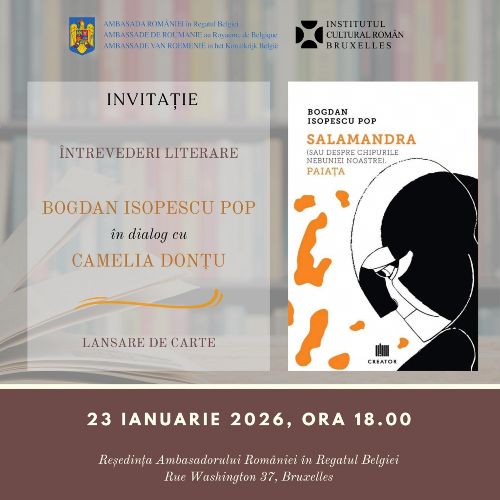Invitatul acestei ediții este Bogdan Isopescu Pop, care își va prezenta cartea „Salamandra, sau despre chipurile nebuniei noastre. Paiața”, apărută la Editura Creator în 2025. Evenimentul se va desfășura sub forma unui dialog cu Camelia Donțu, jurnalist și corespondent PRO TV la Bruxelles. Întâlnirea va fi urmată de o sesiune de autografe. Evenimentul va avea loc în data de 23 ianuarie 2026, ora 18.00, la Reședința Ambasadorului României.