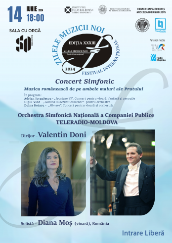 Concertul simfonic din creația compozitorulor români Adrian Iorgulescu, Doina Rotaru și Ulpiu Vlad va avea loc pe data de 14 iunie 2024, ora 18.00, la Sala cu Orgă, și va fi susținut de Orchestra Simfonică a TeleRadio Moldova sub bagheta maestrului Valentin Doni, solistă Diana Moș (vioară).
