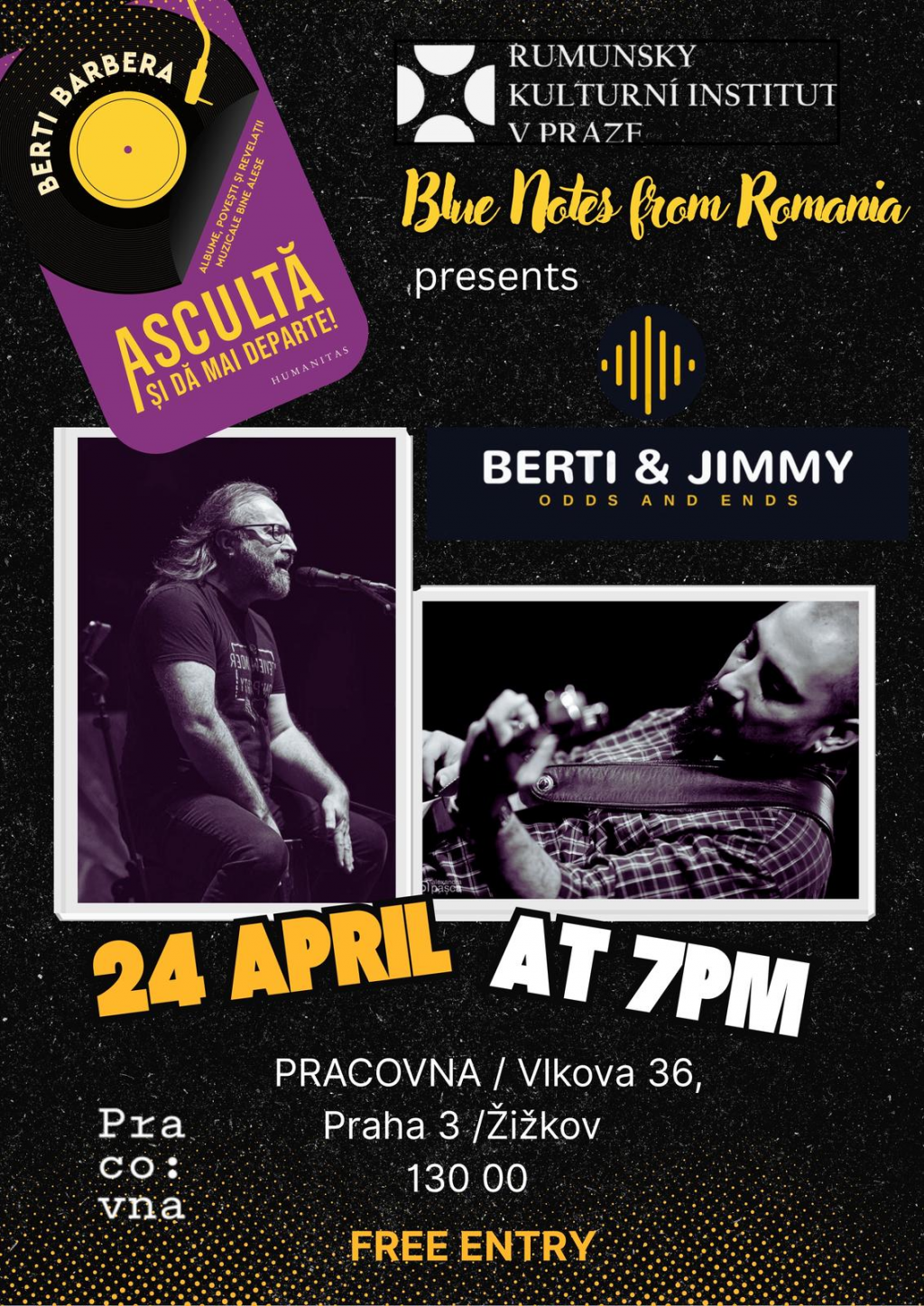 Vineri, 24 aprilie, de la ora 19.00, sunteți invitați la un eveniment de jazz de neratat la Pracovna, Vlkova 36, Praga 3: Blue Notes from Romania – Berti Barbera și Adalbert Cserkész în concert la Praga urmat de prezentarea cărții Ascultă și dă mai departe! a lui Berti Barbera.
