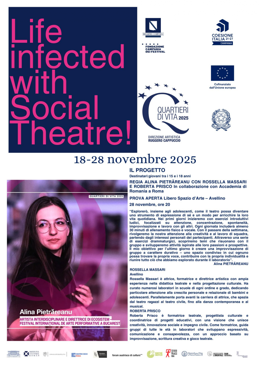 Gli atelier di qui se ne occuperà Alina Pietrăreanu si svolgeranno nel periodo 18-28 novembre 2025, in Avellino, nella regione Campania e saranno in collaborazione con l’attrice, formatrice e direttrice artistica Rossella Massari e la formatrice teatrale, progettista culturale e coordinatrice di progetti educativi Roberta Prisco.