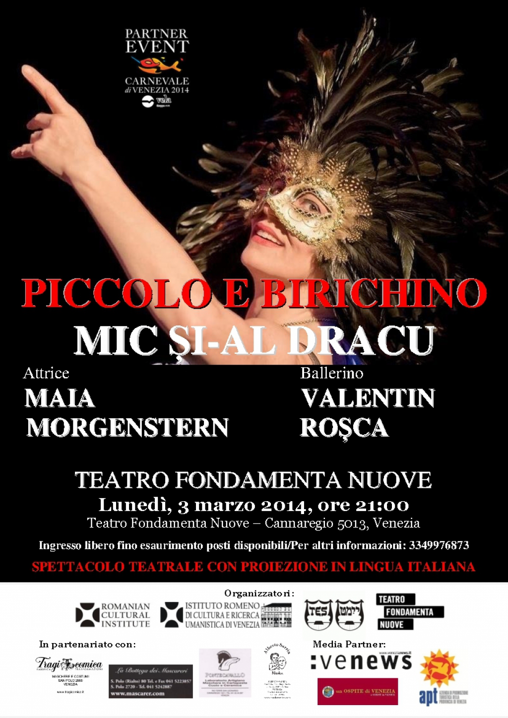 Luni, 3 martie 2014, începând cu ora 21:00, pe scena Teatrului Fondamenta Nuove din Veneţia, Institutul Român de Cultură şi Cercetare Umanistică de la Veneţia, în parteneriat cu Teatrul Evreiesc de Stat din Bucureşti, VELA – Gruppo AMA şi Teatro Fondamenta Nuove, prezintă piesa de teatru „Mic şi-al dracu | Piccolo e birichino” cu actriţa Maia MORGENSTERN şi balerinul Valentin ROŞCA.