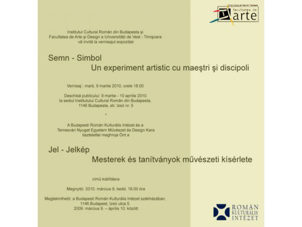 Pe 9 martie 2010, orele 18:00, la sediul ICR Budapesta va avea loc vernisajul expoziţiei de artă "Semn – Simbol, un experiment artistic cu maeştri şi discipoli", proiect care aduce laolaltă nume consacrate ale artei vizuale româneşti şi tineri artişti în afirmare de la Facultatea de Arte şi Design din Timişoara.
