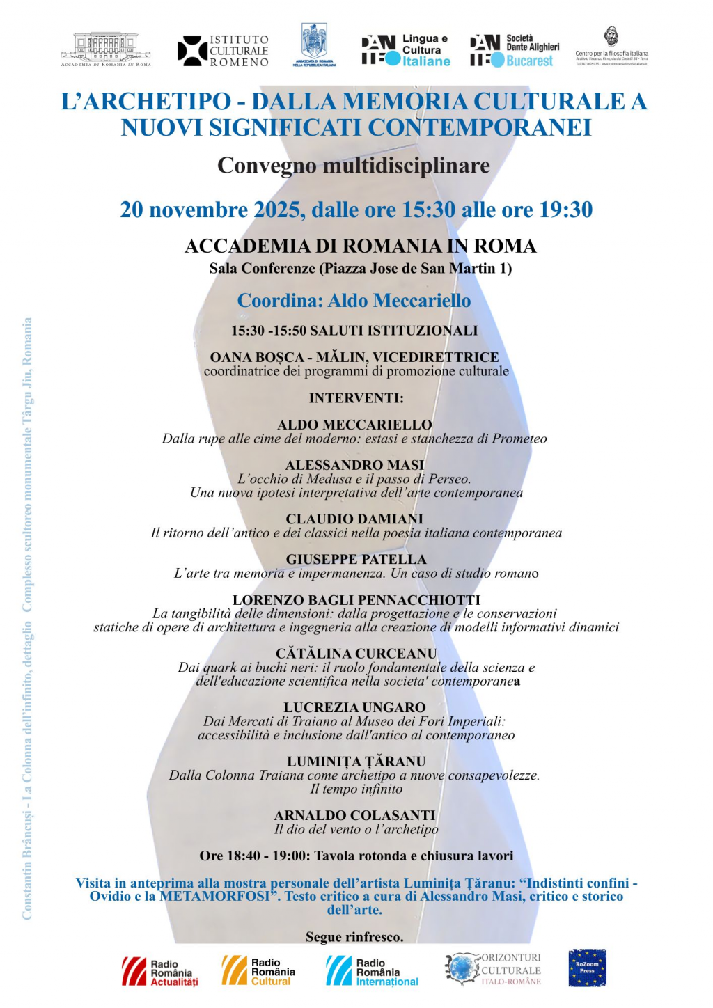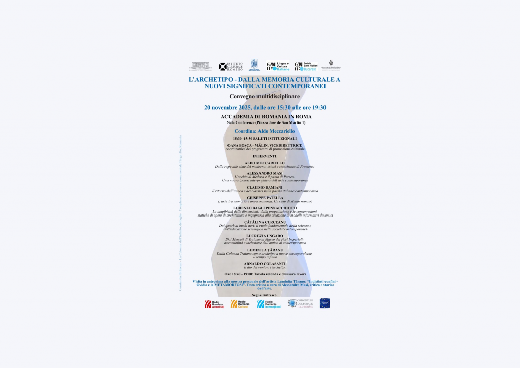 Accademia di Romania din Roma are plăcerea de a găzdui colocviul multidisciplinar „Arhetipul - de la memoria culturală la noi semnificații contemporane”, care va avea loc joi, 20 noiembrie, de la ora 15:30 la 19:30. Evenimentul se bucură de patronajul Ambasadei României în Italia, al Societății „Dante Alighieri” din Roma, al Comitetului „Dante Alighieri” din București și al Centrului de Filosofie Italiană.
