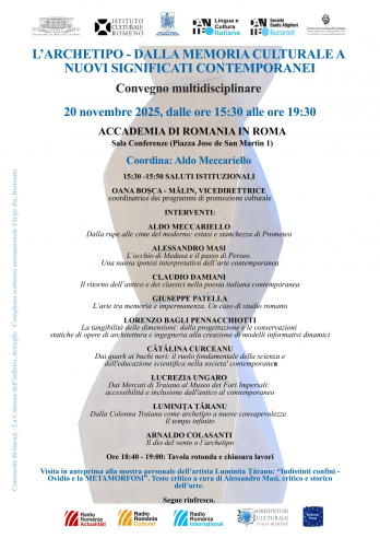 ARHETIPUL - DE LA MEMORIA CULTURALĂ LA NOI SEMNIFICAȚII CONTEMPORANE Colocviu multidisciplinar ACADEMIA ROMANIA DIN ROMA Sala de conferinte Piața José de San Martin, nr. 1, Roma, 00197 20 noiembrie 2025, de la 15:30 la 19:30 Accademia di Romania din Roma are plăcerea