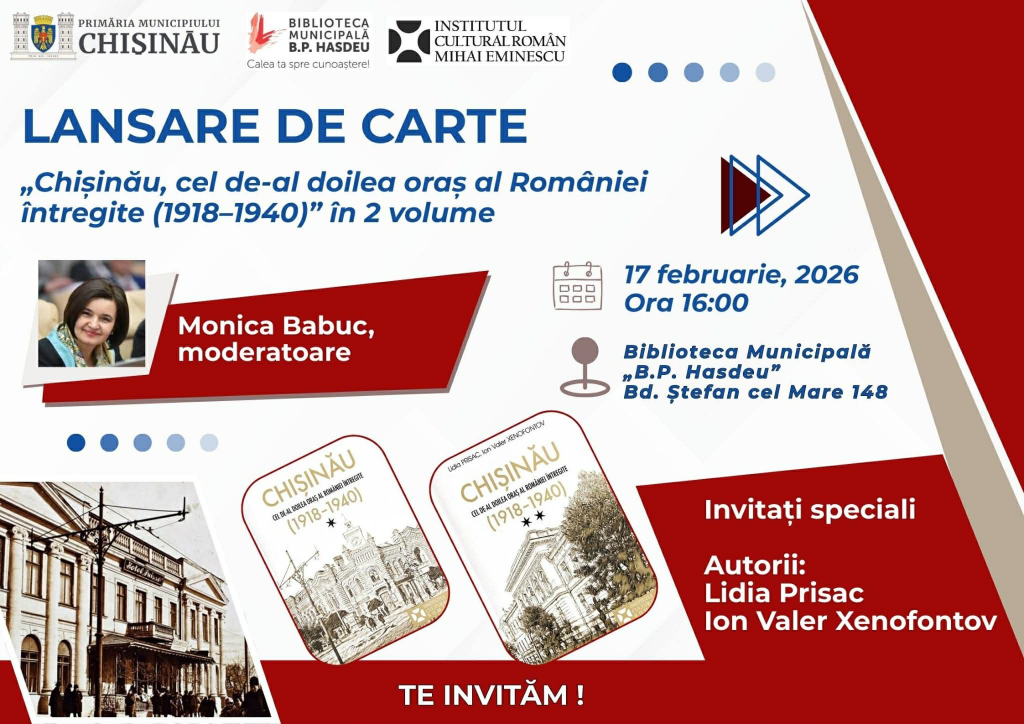 Institutul Cultural Român „Mihai Eminescu” la Chișinău, împreună cu Biblioteca Municipală „B.P. Hasdeu”, organizează lansarea volumului „Chișinău - cel de-al doilea oraș al României întregite (1918-1940)” de Lidia Prisac și Ion Xenofontov. Lansarea va avea loc în data de 17 februarie, la ora 16.00, la sediul Bibliotecii Municipale „B.P. Hasdeu”.