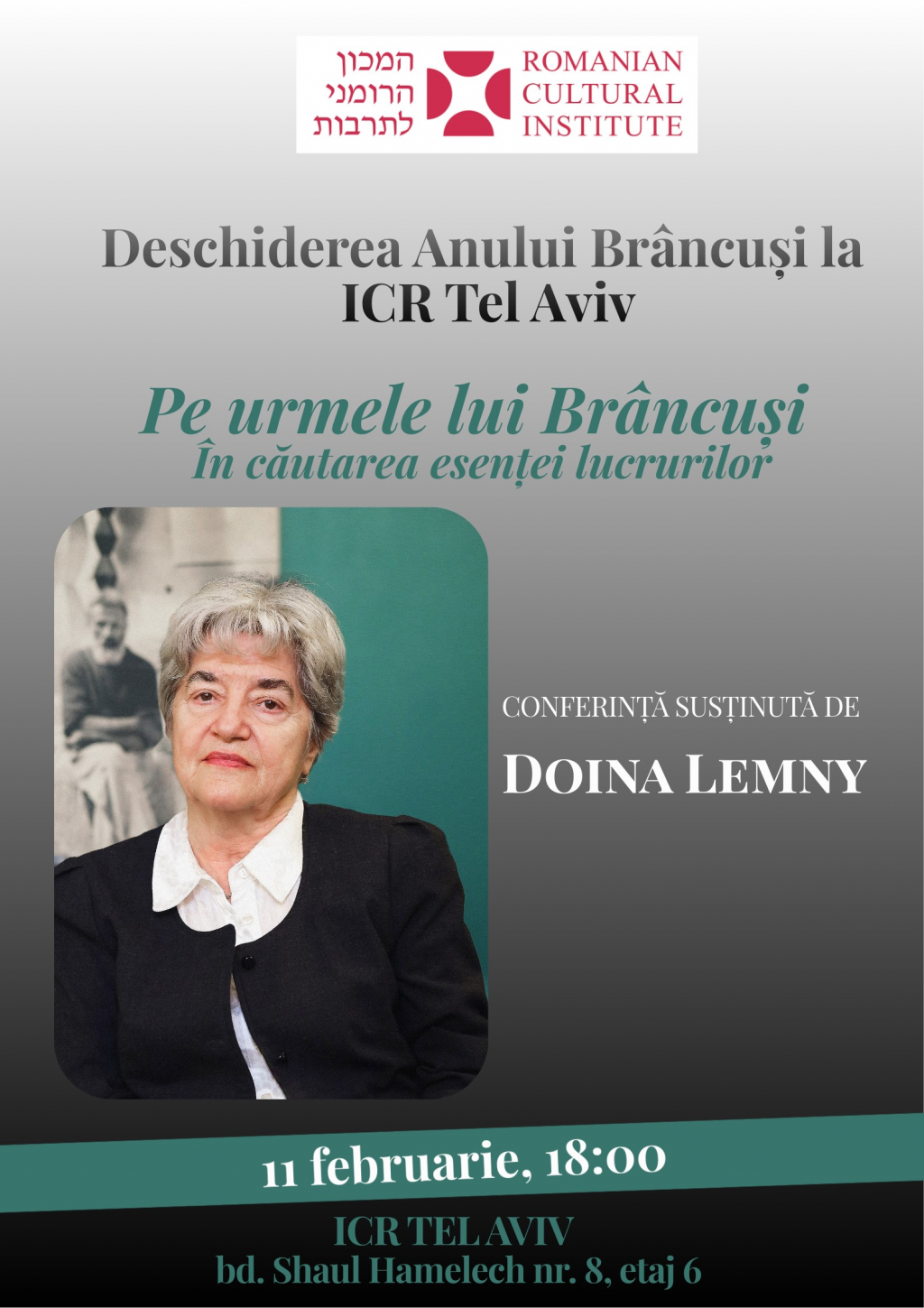 Un public cunoscător, numeros și entuziast a fost prezent la întâlnirea cu Doina Lemny, dedicată operei lui Constantin Brâncuși, găzduită de Institutul Cultural Român de la Tel Aviv la 11 februarie 2026. Conferința susținută de cunoscutul muzeograf, critic și istoric de artă a fost organizată cu prilejul deschiderii oficiale a „Anului Brâncuși” de la ICR Tel Aviv, 2026 fiind anul în care se împlinesc 150 de ani de la nașterea marelui sculptor român (19 februarie 1876, Hobița).