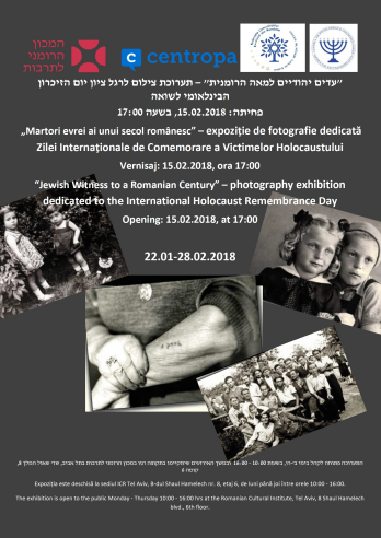The Romanian Cultural Institute in Tel Aviv, in collaboration with Centropa, is hosting between January 22 – February 28, 2018, a selection of 15 works from the documentary photography exhibition “Jewish witness to a Romanian century – Images and Stories from the Centropa Interviews ”, dedicated to marking the International Holocaust Remembrance Day.