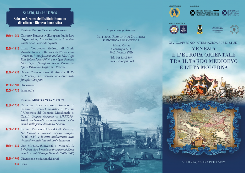 XIV Convegno internazionale di studi «Venezia e l’Europa Orientale tra il tardo Medioevo e l’Età moderna», Istituto Romeno di Cultura e Ricerca Umanistica, Venezia, 17–18 aprile 2026