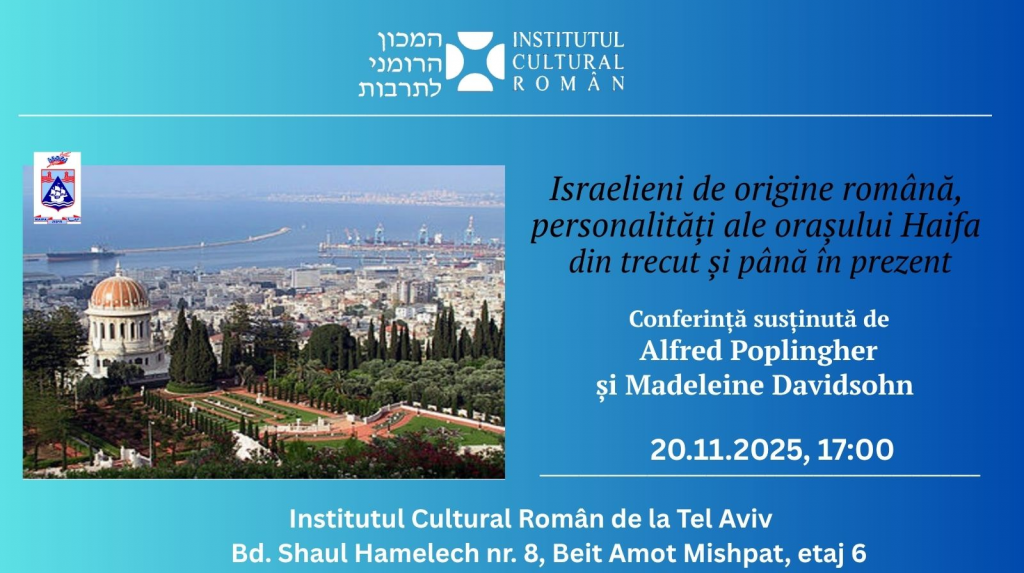 Institutul Cultural Român de la Tel Aviv va organiza și găzdui, în data de 20 noiembrie, conferința „Israelieni de origine română, personalități ale orașului Haifa”, susținută de Madeleine Davidsohn și Alfred Poplingher, unii dintre cei mai activi și cunoscuți membri ai comunității românești din Israel, ambii locuitori ai orașului Haifa.