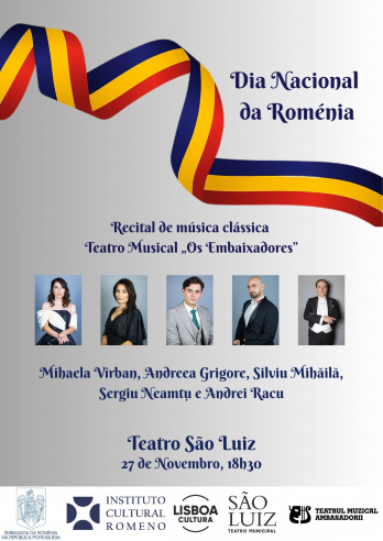 Institutul Cultural Român din Lisabona împreună cu Ambasada României în Republica Portugheză celebrează Ziua Națională a României joi, 27 noiembrie 2025, orele 18:30, la teatrul São Luiz din capitala Portugaliei, printr-un concert de muzică clasică susținut de artiștii Teatrului Muzical „Ambasadorii”.