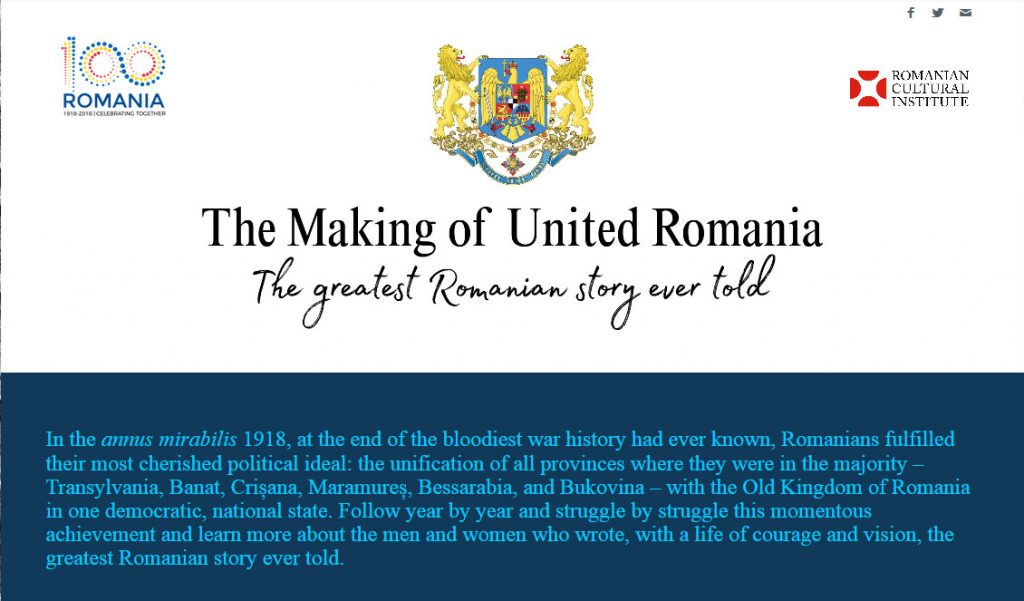 The website covers the Romanian participation in the WWI in the Allied camp, the democratic movements that led to the 1918 unification of all Romanian provinces, the recognition of United Romania at the Paris Peace Conference and the liberal design of the new Romanian state. It also pays tribute to the great men and women who made the Great Union possible.