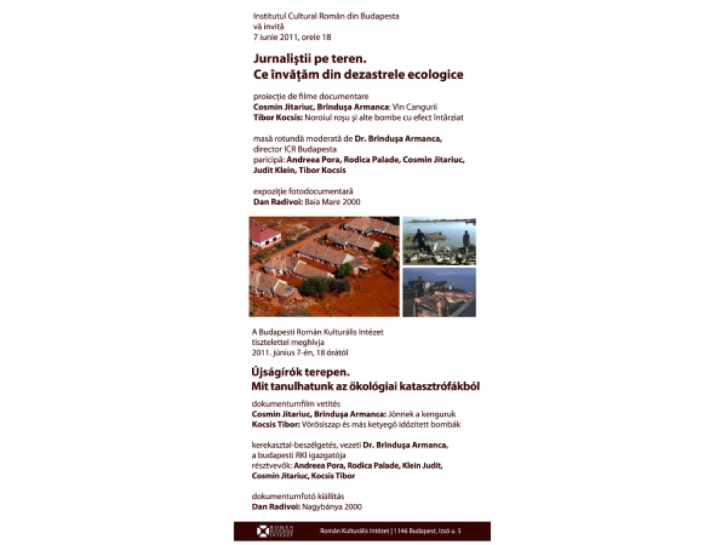 Filme documentare despre accidentele ecologic recente din Ungaria și România, prezentări, o expoziţie fotodocumentară şi un dialog purtat de jurnalişti, regizori şi cameramani care s-au aflat la faţa locului vor fi punctele de sprijin pentru o dezbatere despre exigenţele în realizarea ştirilor, reportajelor şi interviurilor în cazul catastrofelor ecologice. Simpozionul Jurnaliştii pe teren. Ce învăţăm din dezastrele ecologice, organizat pe 7 iunie 2011 (orele 18) la sediul ICR Budapesta oferă prilejul jurnaliştilor din România şi Ungaria de a sublinia problemele etice, sociale, economice care pot fi întâlnite în ambele ţări, modul cum sunt tratate problemele ecologice în România şi în Ungaria, cum pot fi pregătiţi jurnaliştii pentru a face faţă unor situaţii imprevizibile sau foarte delicate. Evenimentul deschis marelui public va oferi posibilitatea de a pătrunde în culisele realizării şi unor reportaje, filme documentare etc.