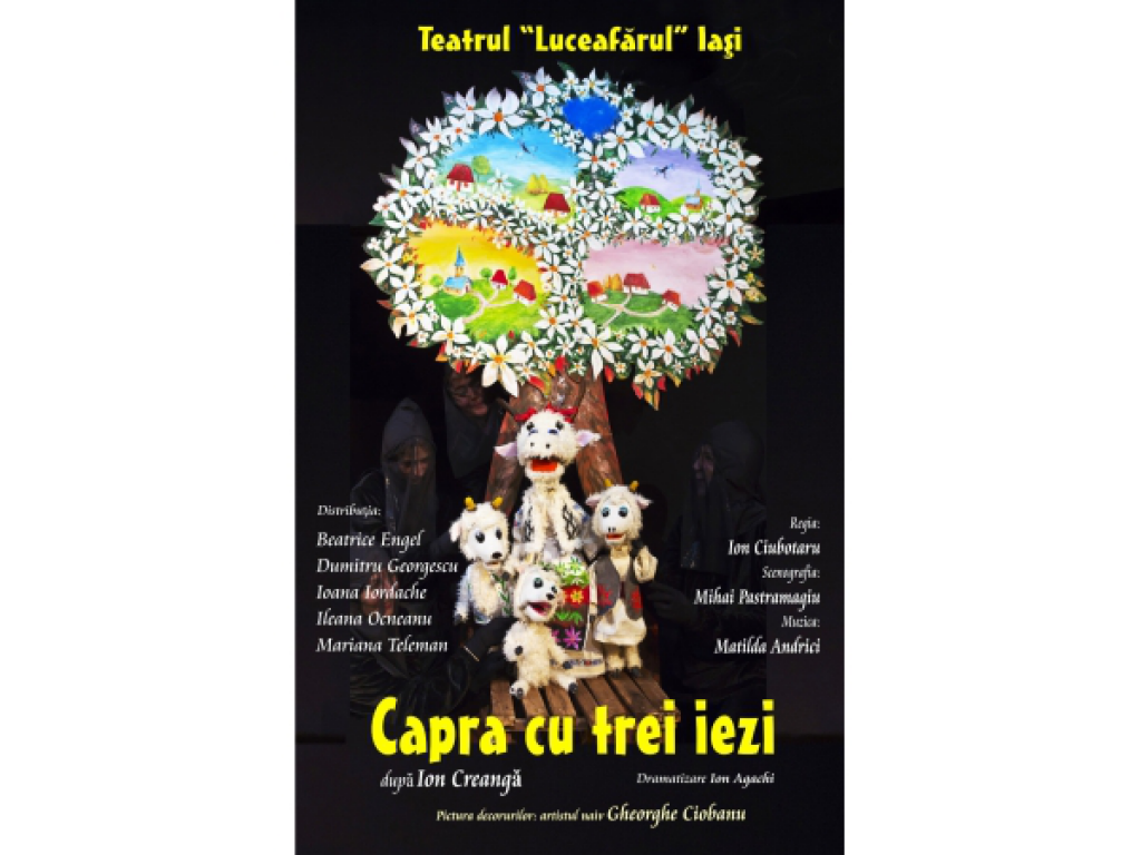 Spectacolul „Capra cu trei iezi” după Ion Creangă este versiunea scenică a cunoscutei poveşti a lui Ion Creangă dezvoltă regizoral spiritul ei popular, refăcând atmosfera satului de odinioară atât sub aspect scenografic, cât şi în planul sonorităţilor. Ideea realizatorilor este să readucă în atenţie jocurile şi jucăriilor de altădată ale copiilor, prin utilizarea unor materiale şi practici specifice tradiţiilor folclorice româneşti.