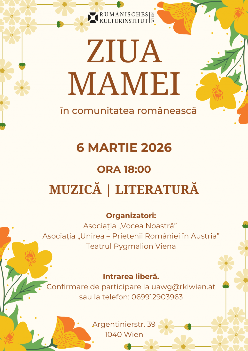Institutul Cultural Român de la Viena vă invită să sărbătoriți Ziua Mamei în cadrul unui eveniment special dedicat figurii materne, simbol al iubirii și devotamentului. Manifestarea are loc pe 6 martie, la ora 18.00, la ICR Viena. Evenimentul este dedicat comunității românești din Viena și reprezintă o inițiativă realizată de către asociațiile „Vocea Noastră” și „Unirea – Prietenii României în Austria”, care își aduc contribuția la acest omagiu adus mamei și valorilor familiei.